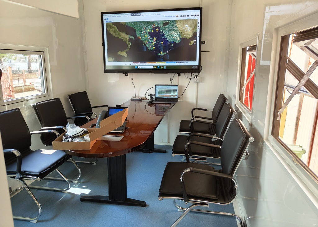 Το επιχειρησιακό κέντρο διαθέτει έξι θέσεις εργασίας και αίθουσα συσκέψεων – συντονισμού των επιχειρήσεων, κάθε θέση εργασίας είναι εξοπλισμένη με υπολογιστή και τηλέφωνο, ενώ διαθέτει δύο κεντρικές οθόνες στην κάθε αίθουσα που δίνουν την εικόνα σε πραγματικό χρόνο μιας κατάστασης έκτακτης ανάγκης.