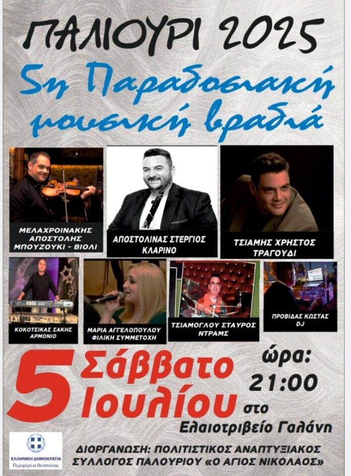Ο Πολιτιστικός-Αναπτυξιακός Σύλλογος Παλιουρίου ο Άγιος Νικόλαος, σε συνδιοργάνωση με την Περιφέρεια Θεσσαλίας διοργανώνει πανηγύρι για 5η χρονιά στο Παλιούρι, στα γραφεία του συλλόγου στο ελαιοτριβείο Γαλάνη.