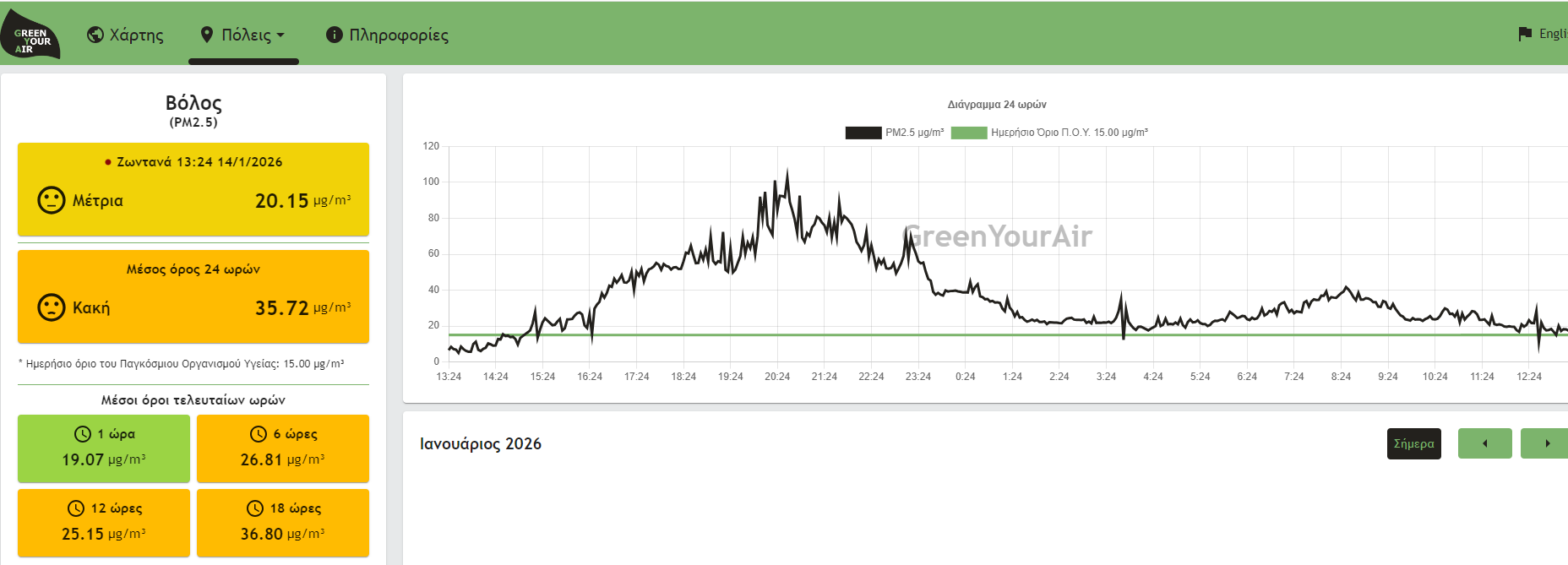 Σύμφωνα με την πλατφόρμα GreenYourAir του Τμήματος Μηχανολόγων Μηχανικών του ΠΘ, το από το μεσημέρι της Τρίτης έως και σήμερα το μεσημέρι, τα μικροσωματίδια ΡΜ 2,5 είναι πάνω από το επιτρεπτό όριο των 15 μικρογραμμαρίων ανά κυβικό μέτρο αέρα.