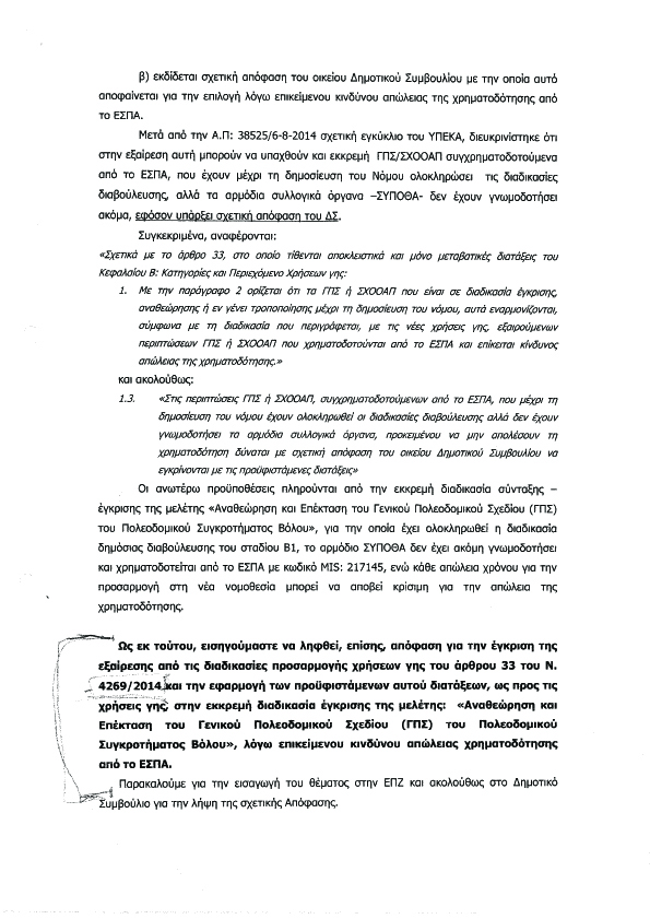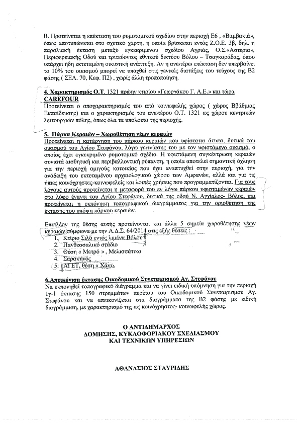 Ωστόσο ξέχασε (;) να αναφερθεί στο πιο σημαντικά έγγραφα που αποδεικνύουν, ότι μετά το κλείσιμο της Β2 Φάσης του Γ.Π.Σ. Βόλου, η δημοτική Αρχή, προχώρησε σε προτάσεις αλλαγών στην επέκταση του σχεδίου, γεγονός παράτυπο πέρα ως πέρα και μάλιστα χωρίς την υπηρεσιακή συναίνεση, καθώς το έγγραφό είναι υπογεγραμμένο μόνο από τον τότε αντιδήμαρχο Δόμησης και Τεχνικών Υπηρεσιών.