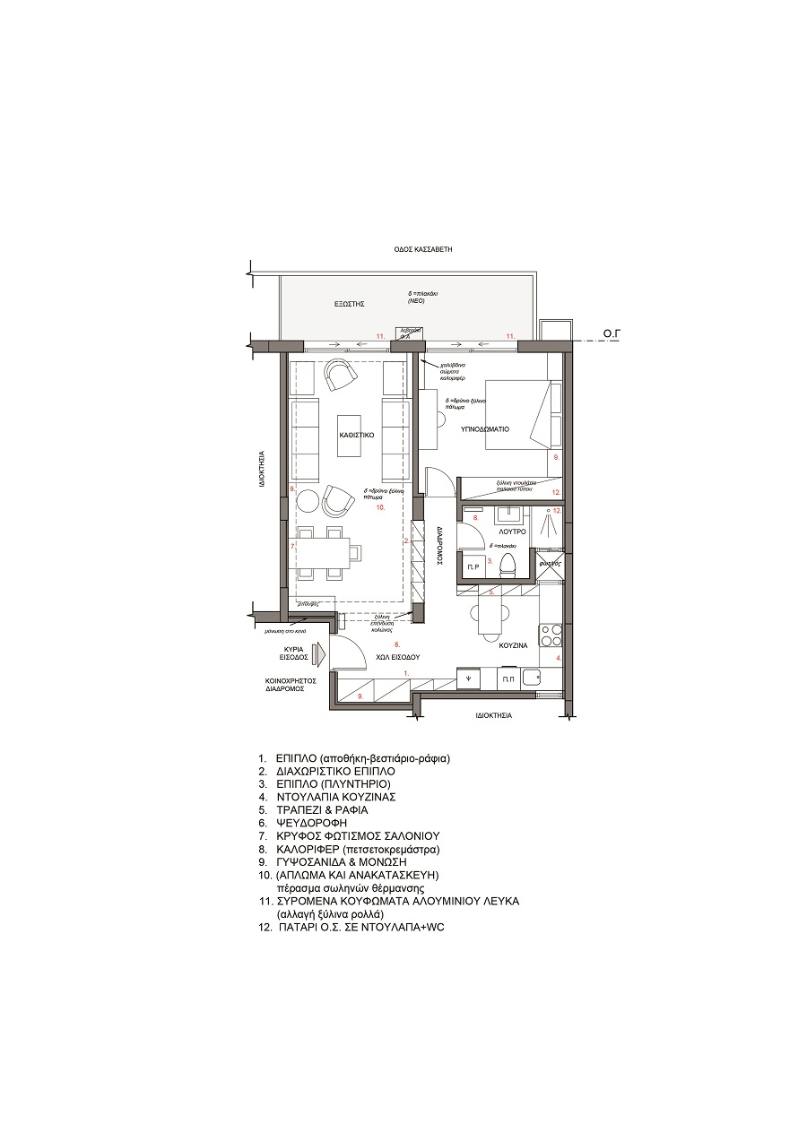 Το διαμέρισμα βρίσκεται σε πολυώροφη πολυκατοικία κατασκευασμένη την δεκαετία του 1970 – 80 επί της οδού Κασσαβέτη και θα χρησιμοποιηθεί για ιδιόχρηση ζευγαριού ( Β΄κατοικία) με μόνιμη διαμονή στην Αθήνα.