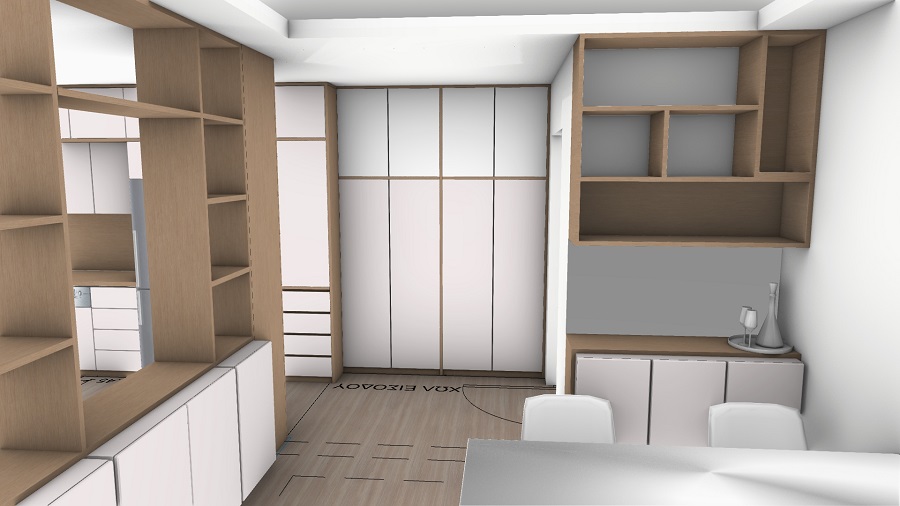 Οι επί μέρους γωνιές δημιουργούνται με σταθερά χρηστικά έπιπλα, κατασκευασμένα από μελαμίνες σε λευκό χρώμα και χρώμα ανοιχτόχρωμου ξύλου, πάχους 25χιλ..