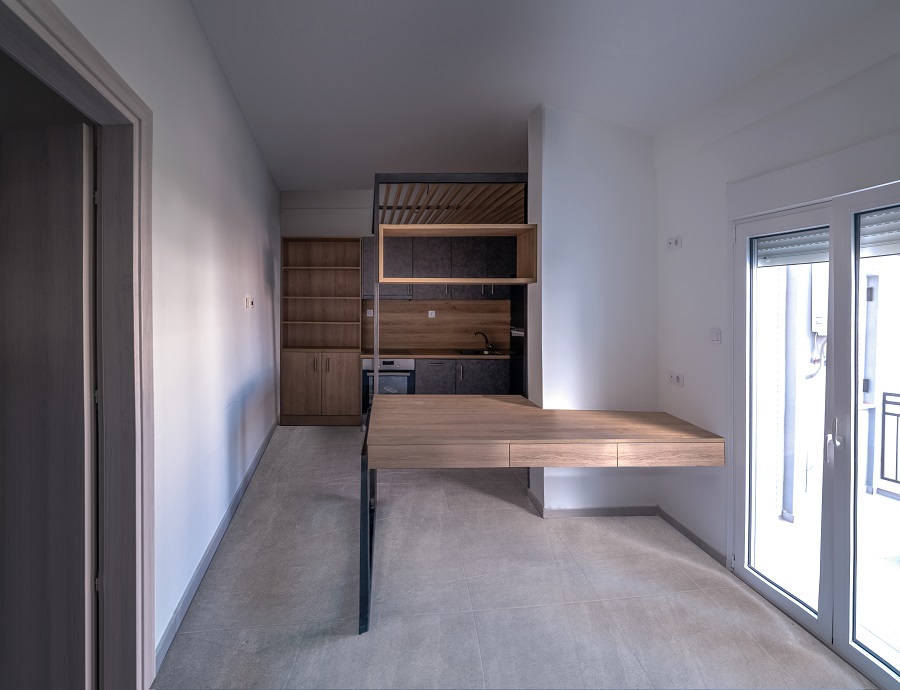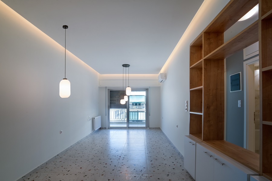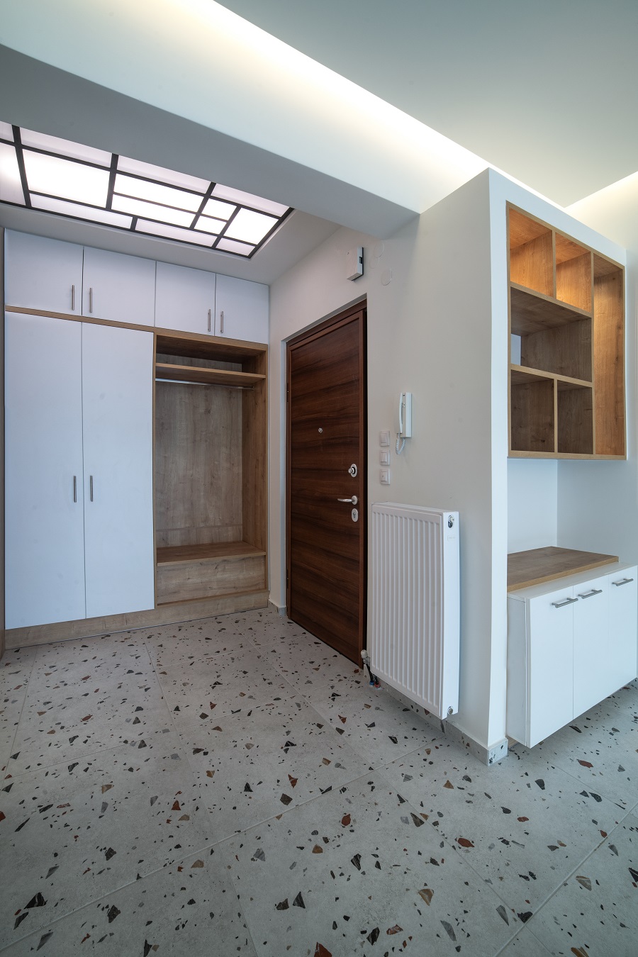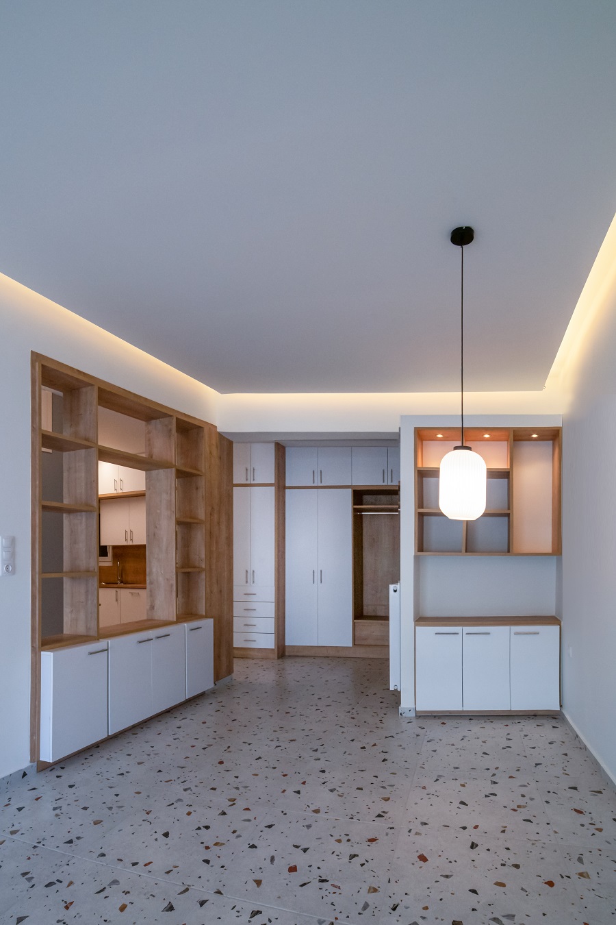 Η ενοποίηση όλων των επί μέρους χώρων, του χωλ της εισόδου, της κουζίνας, του χώρου υποδοχής και του διαδρόμου προς το υπνοδωμάτιο και λουτρό έδωσε σημαντική ανάσα στο διαμέρισμα μεγαλώνοντας κατ’ ουσία προοπτικά, ποιοτικά αλλά και λειτουργικά τον ωφέλιμο εσωτερικό χώρο.