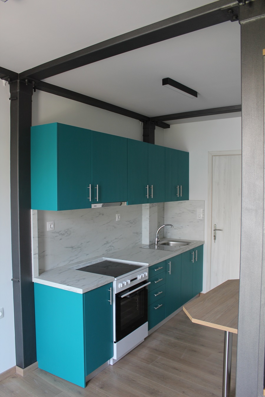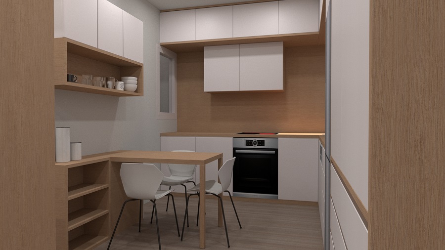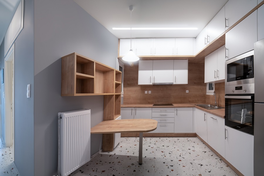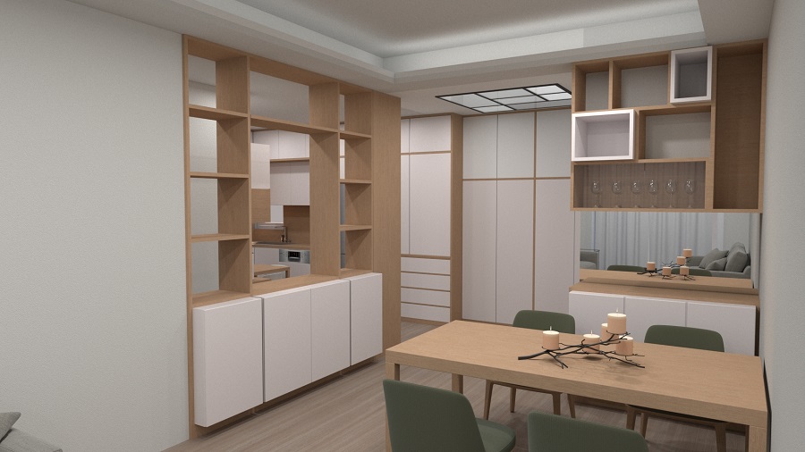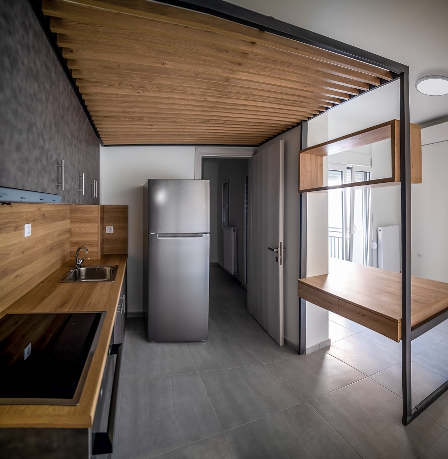 Η ενοποίηση όλων των επί μέρους χώρων, του χωλ της εισόδου, της κουζίνας, του χώρου υποδοχής και του διαδρόμου προς το υπνοδωμάτιο και λουτρό έδωσε σημαντική ανάσα στο διαμέρισμα μεγαλώνοντας κατ’ ουσία προοπτικά, ποιοτικά αλλά και λειτουργικά τον ωφέλιμο εσωτερικό χώρο.