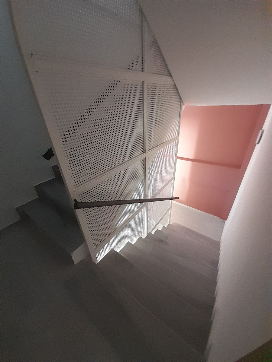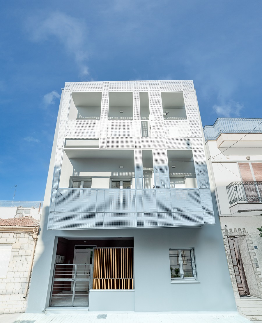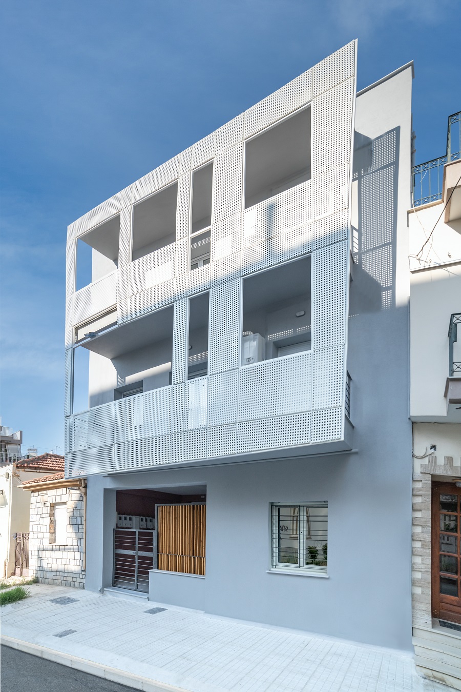 Το εσωτερικό κιγκλίδωμα του κοινόχρηστου κλιμακοστασίου κατασκευάσθηκε από την ίδια λευκή διάτρητη λαμαρίνα που χρησιμοποιήθηκε στην κύρια όψη του κτιρίου.
