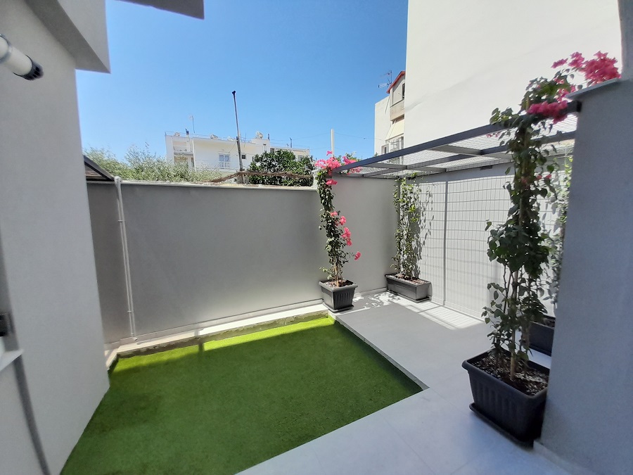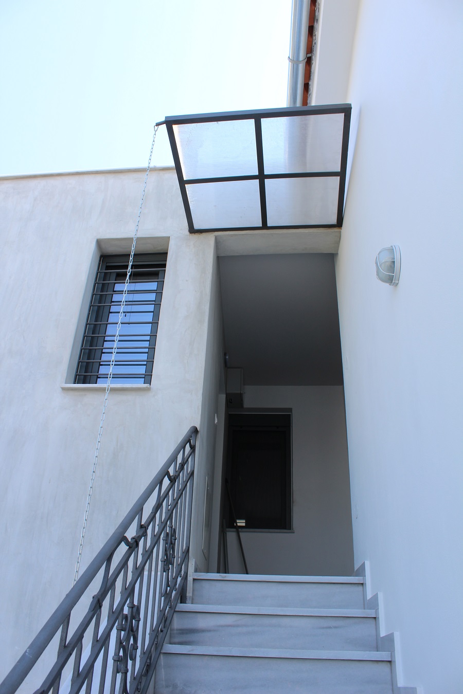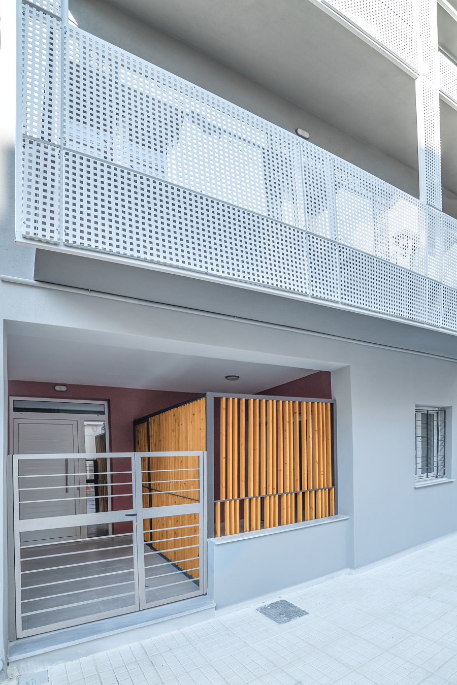 Ο ακάλυπτος χώρος στο ισόγειο αναβαθμίσθηκε με μεταλλική πέργκολα και πράσινο και προσαρτίσθηκε στο διαμπερές διαμέρισμα του ισογείου. Στο ισόγειο διαχωρίσθηκε με ελαφρά ξύλινη διάτρητη κατασκευή από κατακόρυφες διατομές (30Χ80) και ο ημιυπαίθριος χώρος – βεράντα του ιδίου διαμερίσματος,