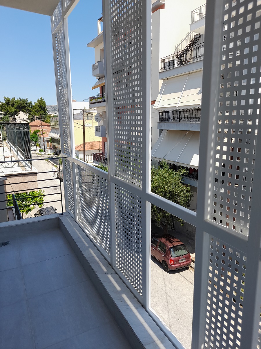 Κατασκευάσθηκε προς τούτο μία δεύτερη μεταλλική όψη- φίλτρο ηλιοπροστασίας στην εξωτερική πλευρά των μπαλκονιών, η οποία αφενός προστατεύει από τον ηλιασμό και αφετέρου δημιουργεί μία ζώνη προστασίας και ανάσχεσης από τις δυσμενείς καιρικές συνθήκες. Περιλαμβάνει δευτερεύοντα μεταλλικό σκελετό από κοιλοδοκούς 60χ60 στερεωμένους στο οπλισμένο σκυρόδεμα των προβόλων και διάτρητη λαμαρίνα αλουμινίου με ορθογώνιες οπές σε χρώμα λευκό.