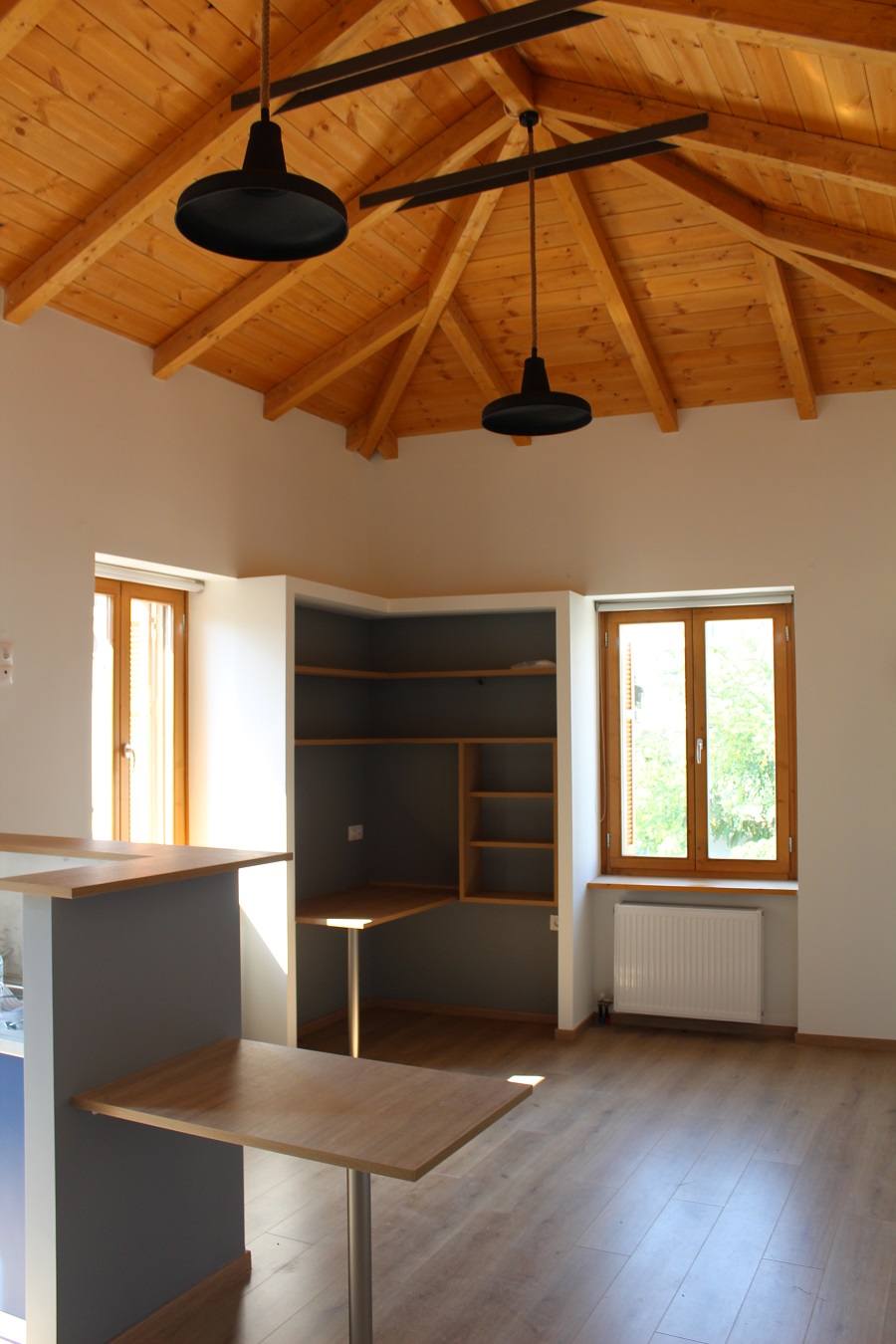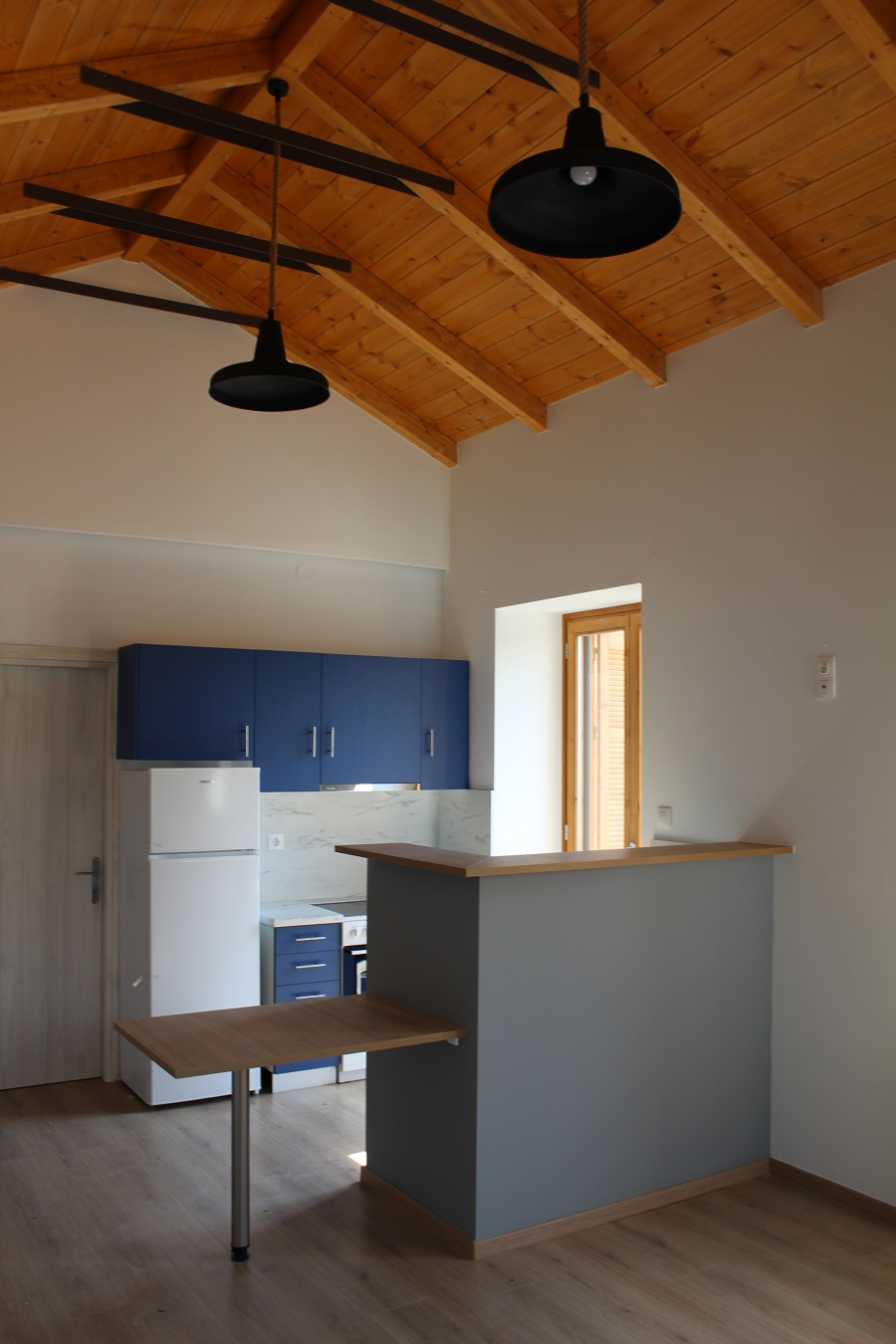 Εσωτερικά τοποθετήθηκαν νέα δάπεδα από γρανιτοπλακάκι 60χ60 πάχους 10 χιλ και σχεδιάσθηκαν ντουλάπια κουζίνας, και σταθερά έπιπλα (γραφείο, βιβλιοθήκες κλπ).