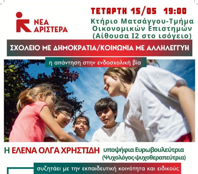 Την Τετάρτη 15 Μαΐου στις 19:00 στο Κτήριο Ματσάγγου – Τμήμα Οικονομικών Επιστημών (Αίθουσα Ι2 στο ισόγειο) θα πραγματοποιηθεί εκδήλωση της Νέας Αριστεράς Μαγνησίας με τίτλο: «Σχολείο με Δημοκρατία/Κοινωνία με Αλληλεγγύη – Η απάντηση στην ενδοσχολική βία».