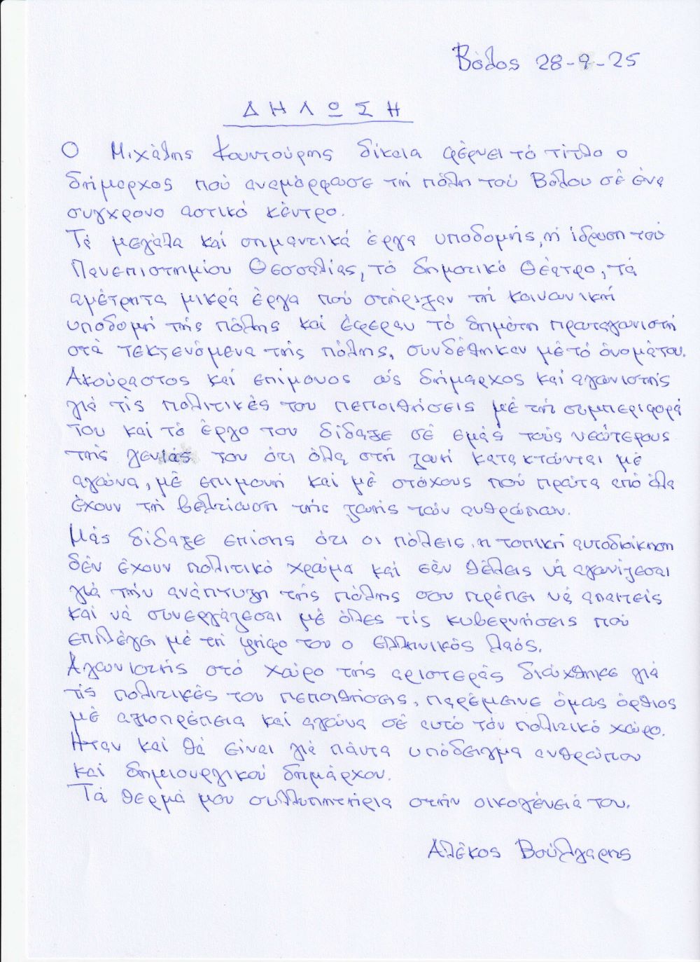 Στην καθοριστική συμβολή του Μιχάλη Κουντούρη στο να καταστεί ο Βόλος ένα σύγχρονο αστικό κέντρο στέκεται με συλλυπητήρια ανακοίνωσή του για τον θάνατό του ο πρώην δήμαρχος Βόλου Αλέκος Βούλγαρης.