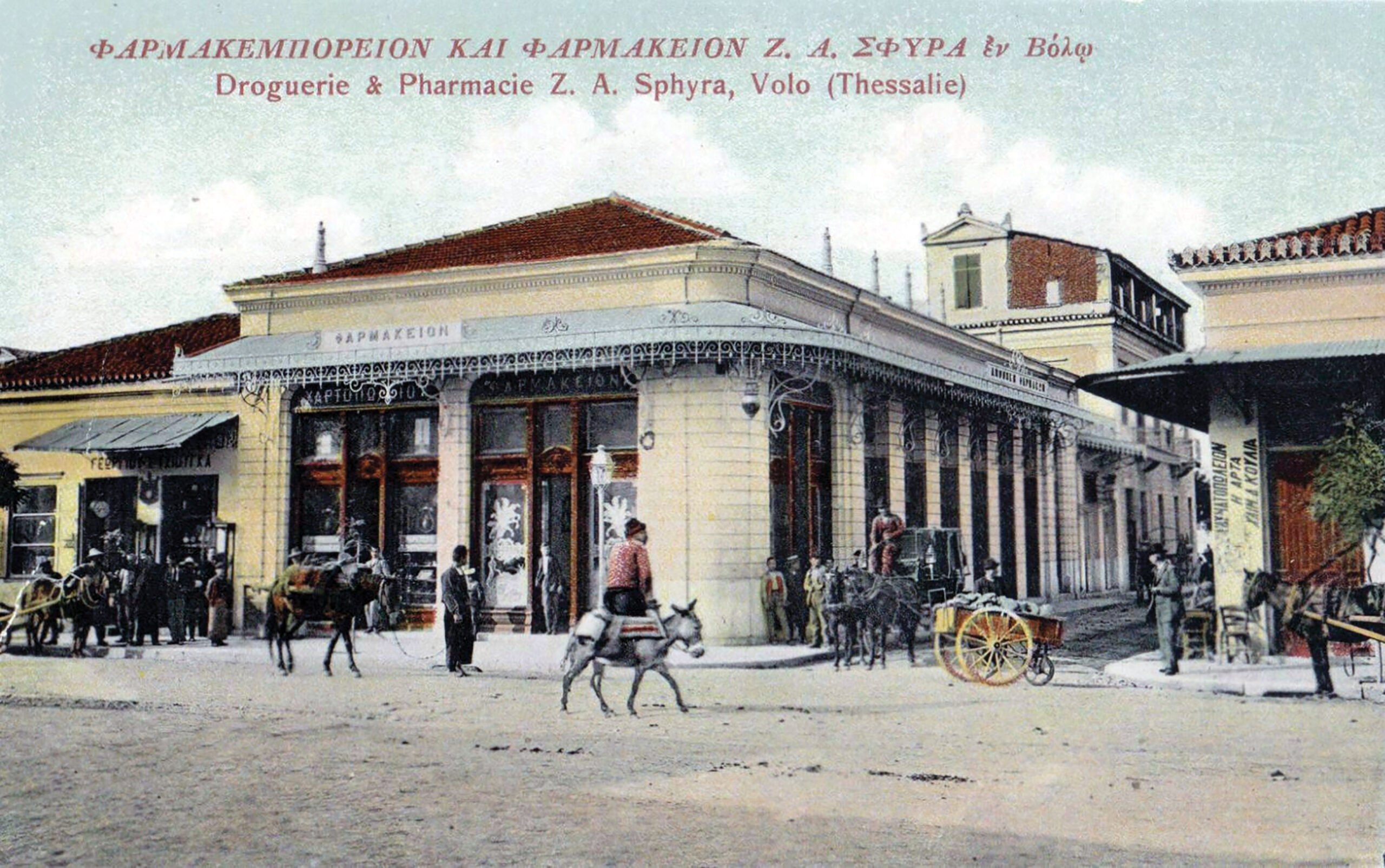 Στη Δημητριάδος με Κοραή στα τέλη του 19ου αιώνα είχε κτισθεί το κόσμημα φαρμακείο-χαρτοπωλείο του Σφύρα που φωτογράφησε ο Στουρνάρας το 1910 και δίπλα ήταν η σιδηροδρομική στάση του ζαχαροπλαστείου Χαλκιαδόπουλου που ακόμη διακρίνεται.