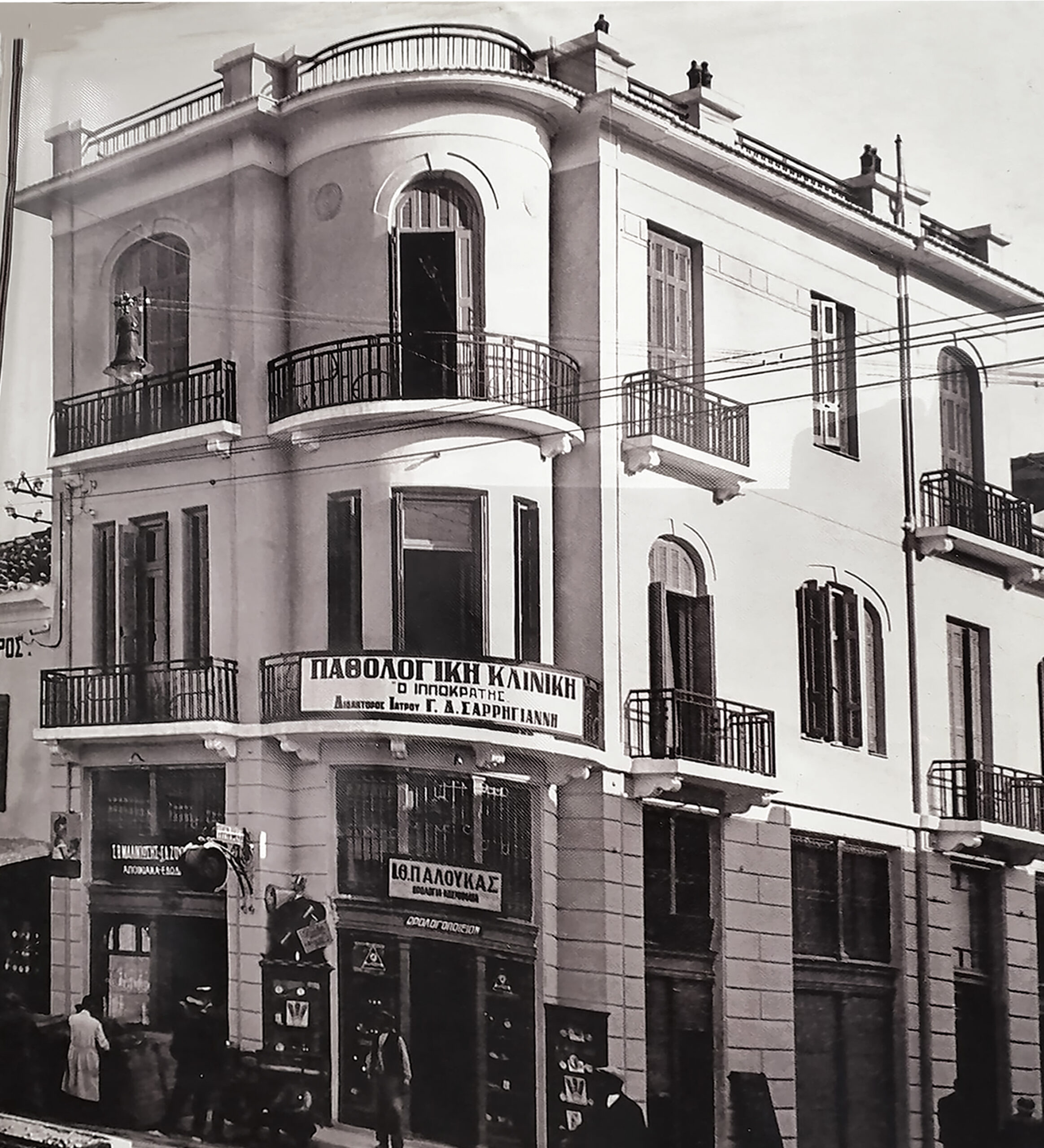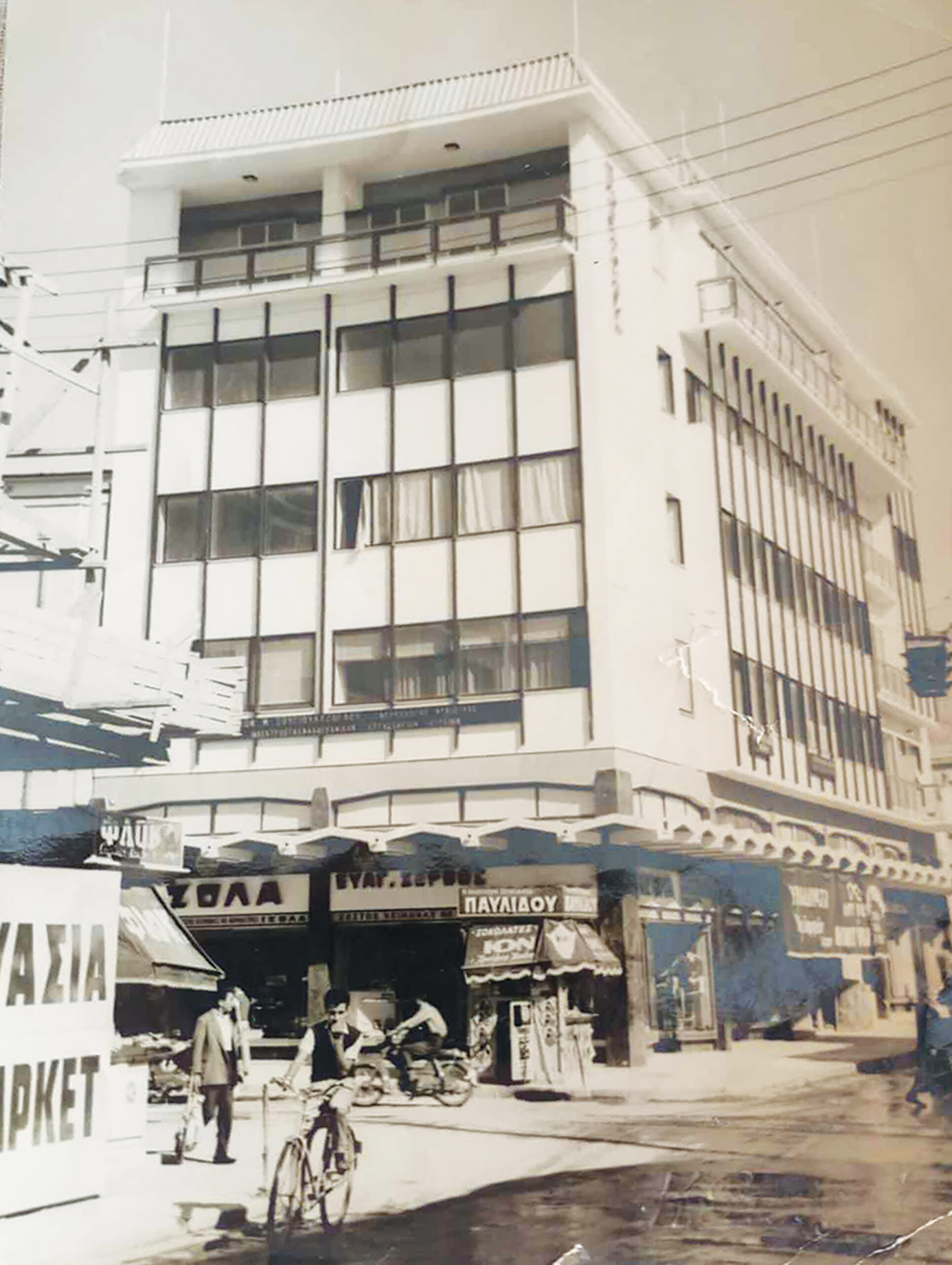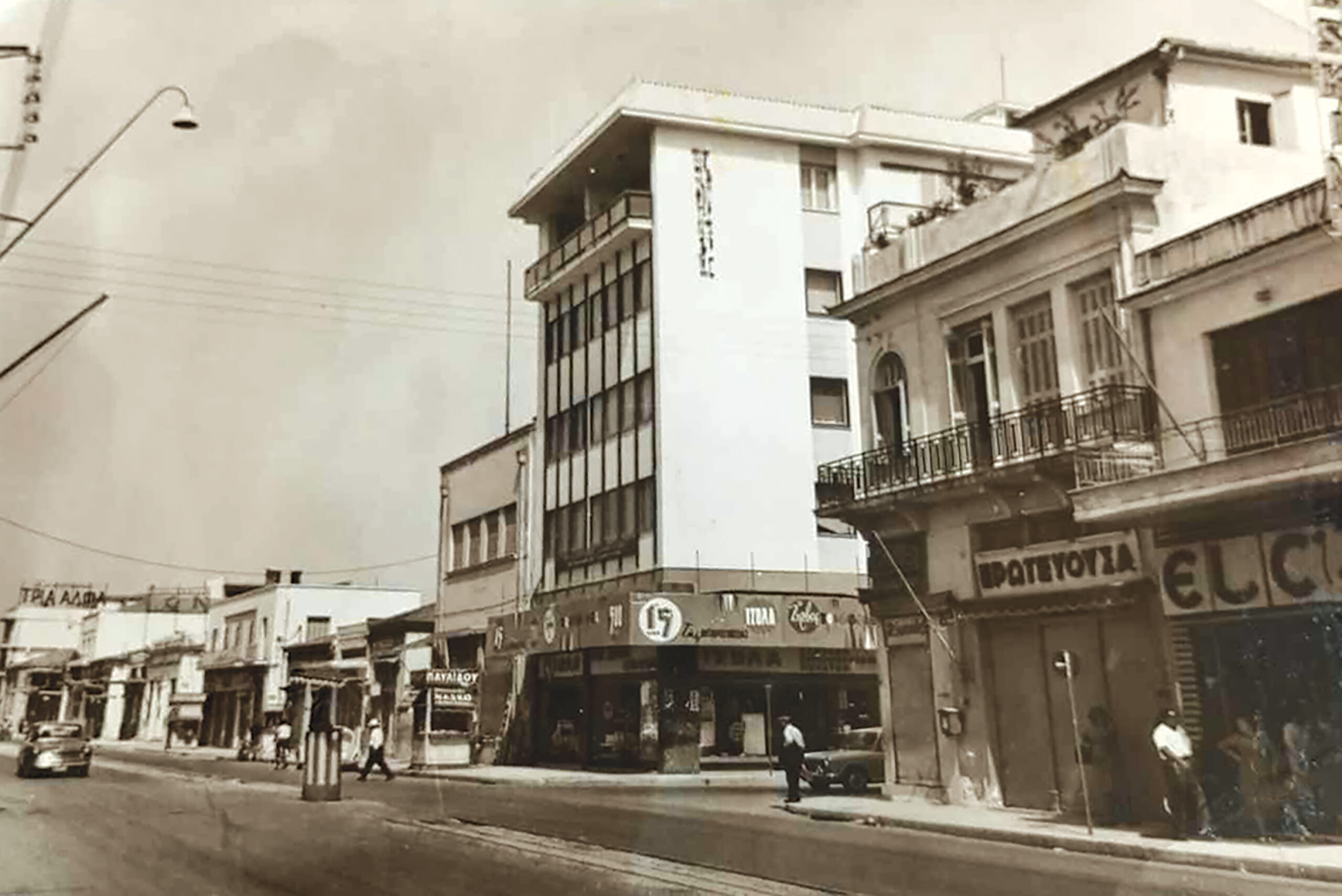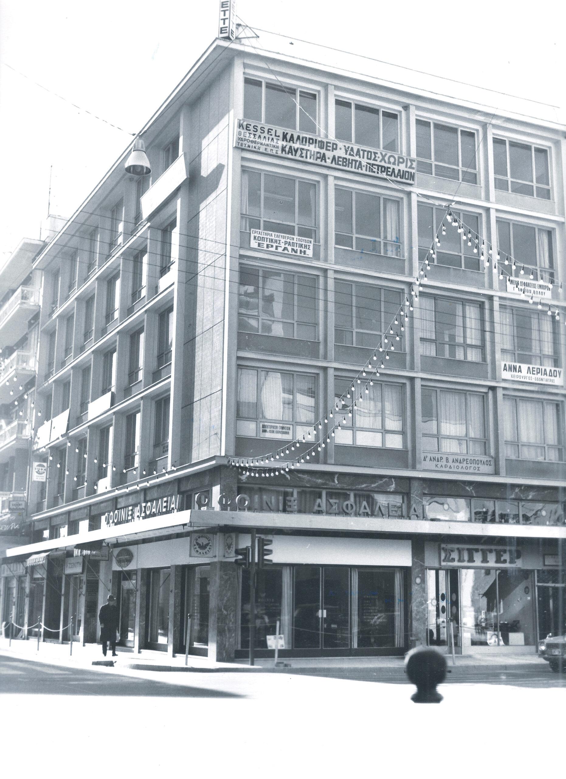 Στο κτίριο εμφανίζεται ψηλά ένα γλυπτό πρωτοποριακό και τα καταστήματα στο ισόγειο η Ιζόλα, Ευάγγελος Ζερβός, δίπλα φαίνεται το διώροφο του ΟΤΕ, τα καταστήματα της πλατείας Πανεπιστημίου που δεν υπάρχουν σήμερα και το υποκατάστημα της Ιονικής Λαϊκής που σήμερα στεγάζεται το σουπερμάρκετ «Γαλαξίας.