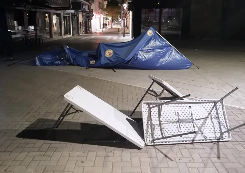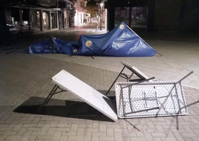 Λόγω του δυνατού αέρα που φυσούσε τα ξημερώματα, στις 5 το πρωί, παρέσυρε το κιόσκι που είχε στήσει η Λέσχη Ειδικών Δυνάμεων στην οδό Ερμού, για το πασχαλινό μπαζάρ της “Φλόγας”, στον Άγιο Νικόλαο.