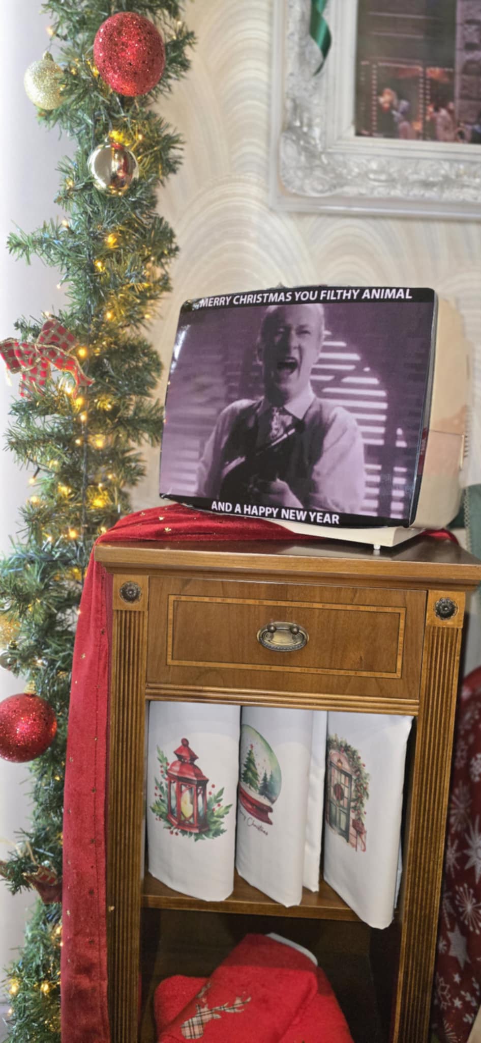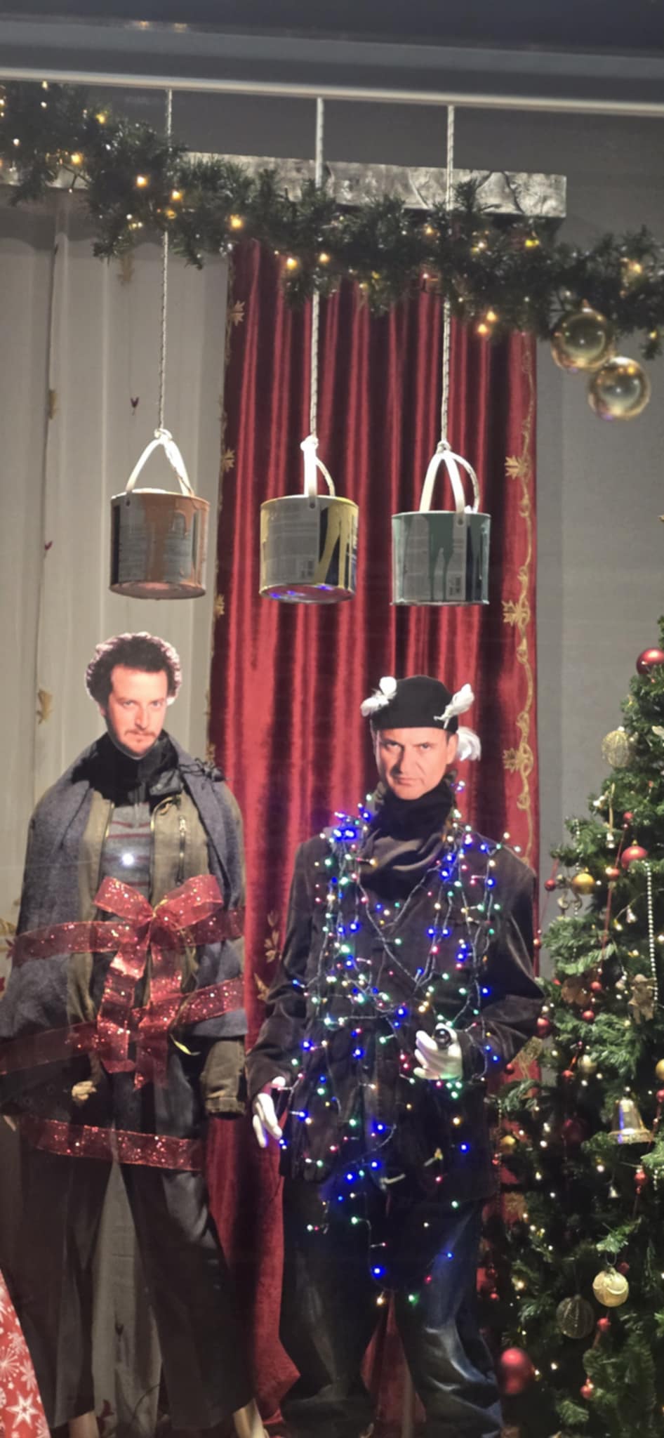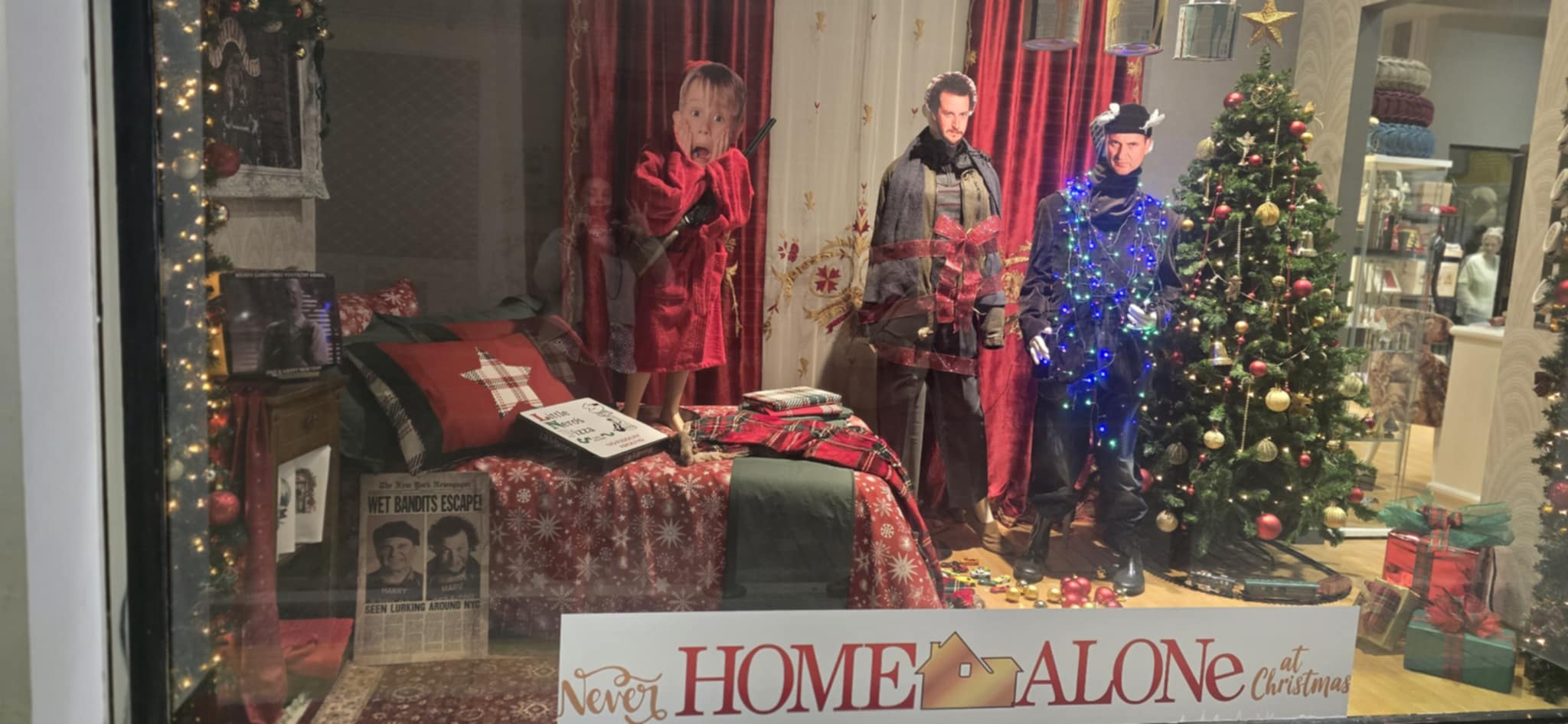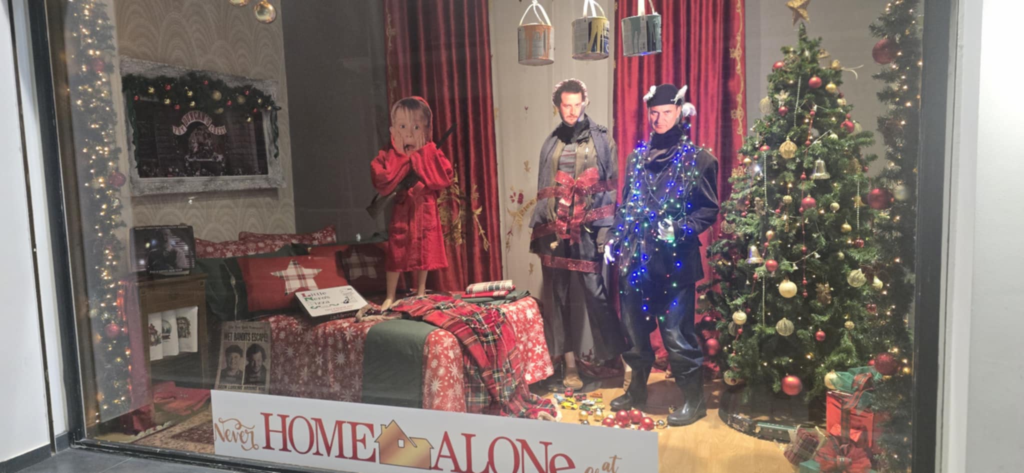 Λαμπιόνια, χιονισμένα στολίδια και ο Κέβιν σε αξέχαστες πόζες μεταφέρουν τους περαστικούς στο πνεύμα των Χριστουγέννων, ενώ η βιτρίνα γίνεται σημείο που συνδυάζει κινηματογραφική νοσταλγία και εορταστική χαρά.
