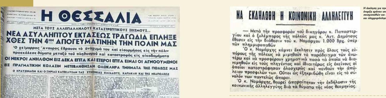 36 νεκρούς κατέγραψε ο Βόλος από εκείνη την ημέρα. Πολλά παιδιά. Πολλά βρέφη. Εγκλωβισμένοι σε οικίες, σε υπόγεια που είχαν καταφύγει για να διαμένουν μετά τη μανία του σεισμού. Στην αναζήτηση του αρχείου των εφημερίδων, 69 και κάτι χρόνια μετά, οι στιγμές εκείνες εμφανίζονται μπροστά στα μάτια μας. Ο πόνος αβάσταχτος που δύσκολα μπορεί να τον αντέξει ανθρώπινη ψυχή, ακόμη Οικογένειες να αναζητούν μέσα στις λάσπες, τους βράχους και τα δέντρα τις παράγκες και το βιός που είχε απομείνει από τον σεισμό του Απριλίου. Άνδρες και γυναίκες να ψάχνουν τα παιδιά τους. Μωρά παιδιά… Τραγική η ιστορία των διδύμων κοριτσιών. Τραγική η ιστορία του μόλις μερικών ημερών μωρού και ενός ακόμη, λίγων μηνών. Ακόμη και τώρα τα ίδια τα γράμματα, οι ίδιες οι λέξεις δεν αρκούν να περιγράψουν τον πόνο, τον θρήνο και το πένθος. Ακόμη και τώρα αυτές οι ιστορίες είναι αρκετές για να κλαίει κανείς για μέρες…