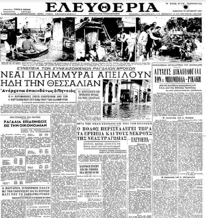 Η ίδια ημέρα είναι γεμάτη φόβο για το ενδεχόμενο συνέχισης των καταστροφικών πλημμυρών. Η ίδια εφημερίδα, στο φύλλο της επόμενης ημέρας (15/10/1955) έχει στο πρωτοσέλιδό της τον τίτλο «Νέαι πλημμύραι απειλούν ήδη την Θεσσαλίαν-Συνεπεία των συνεχιζόμενων ραγδαίων βροχών. Ανέρχεται επικινδύνως ο Πηνειός- Ο κ. Καραμανλής είχεν ειδοποιηθή από τον κ. Καρτάλην περί του κινδύνου των πλημμυρών».