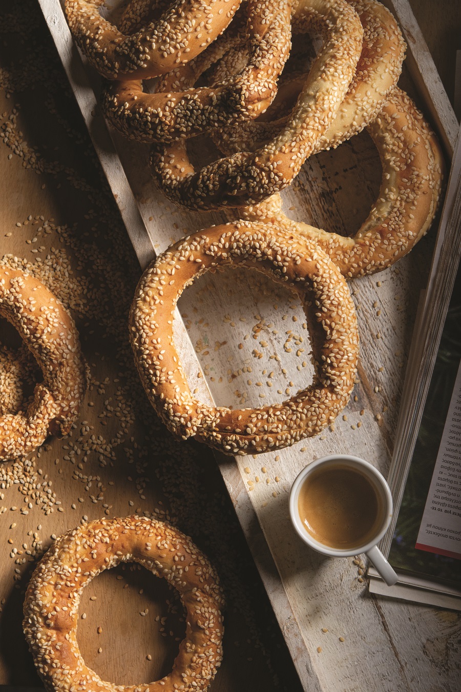Βάζουμε σε ένα μπολ νερό και σε ένα άλλο μπολ το σουσάμι. Φτιάχνουμε με τα κομμάτια ζύμης μπαστούνια μήκους 30 εκ. και σχηματίζουμε κουλούρια. Τα βουτάμε πρώτα στο νερό και μετά στο σουσάμι. Τα βάζουμε σε ταψί στρωμένο με αντικολλητικό χαρτί και τα αφήνουμε για 20 λεπτά σε ζεστό περιβάλλον να φουσκώσουν.