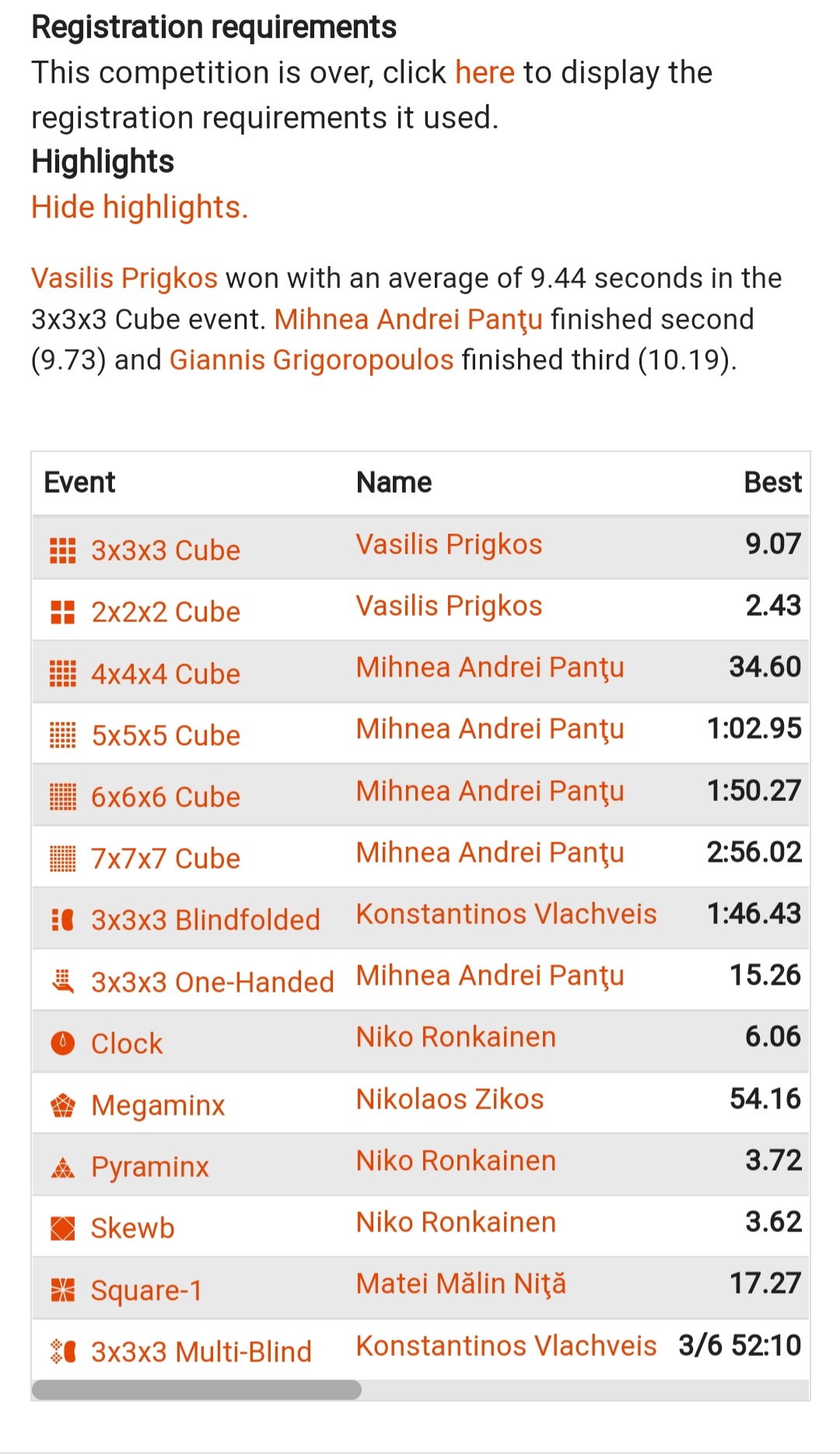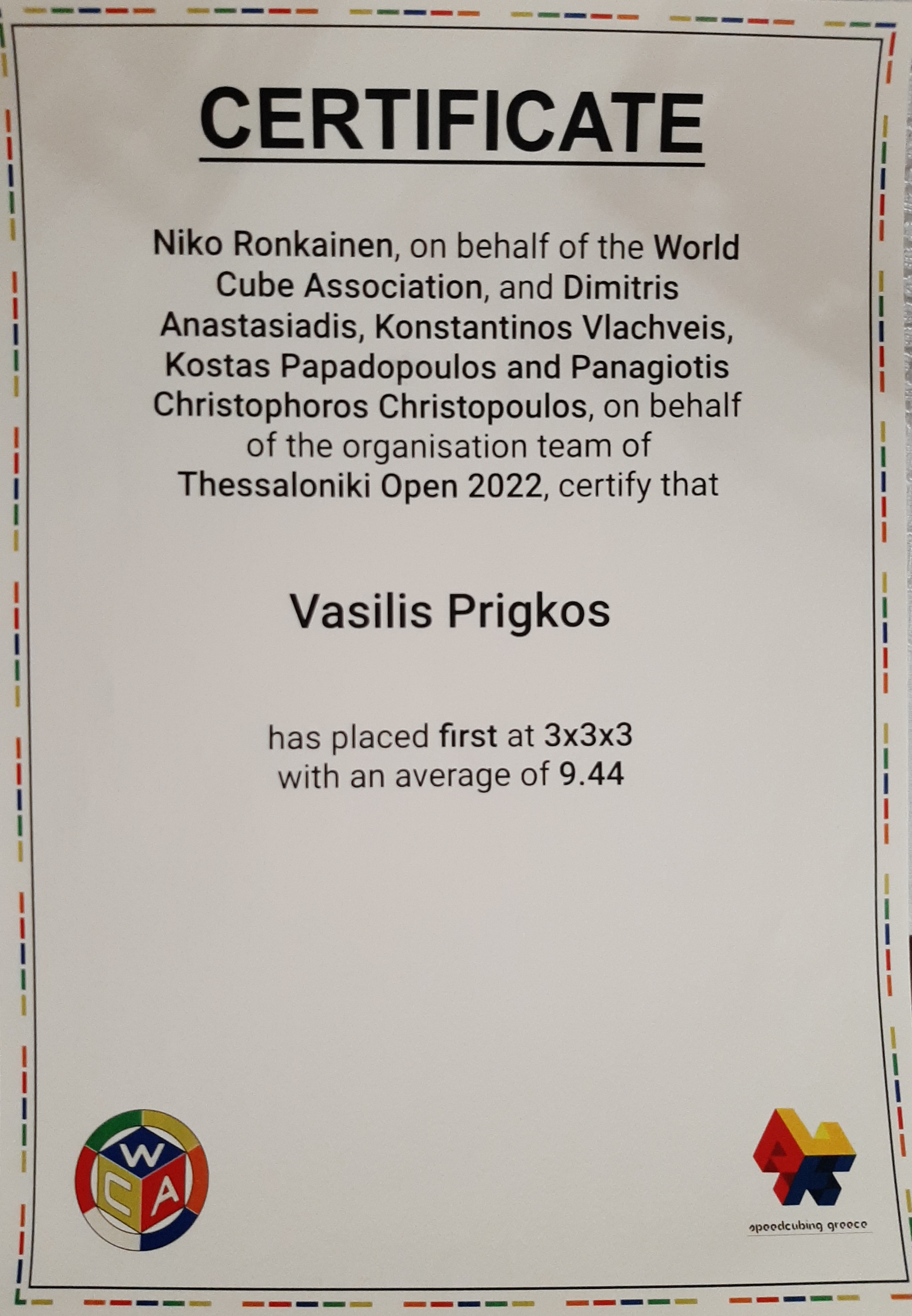 Στο βασικό event που είναι ο 3x3x3, και στα highlights του διαγωνισμού, ο Βολιώτης Βασίλης Πρίγκος κατέκτησε την πρώτη θέση αφού έλυσε τον κύβο σε 9,44 δευτερόλεπτα (μέσο όρο), με καλύτερη single λύση τα 9,07 δευτερόλεπτα.