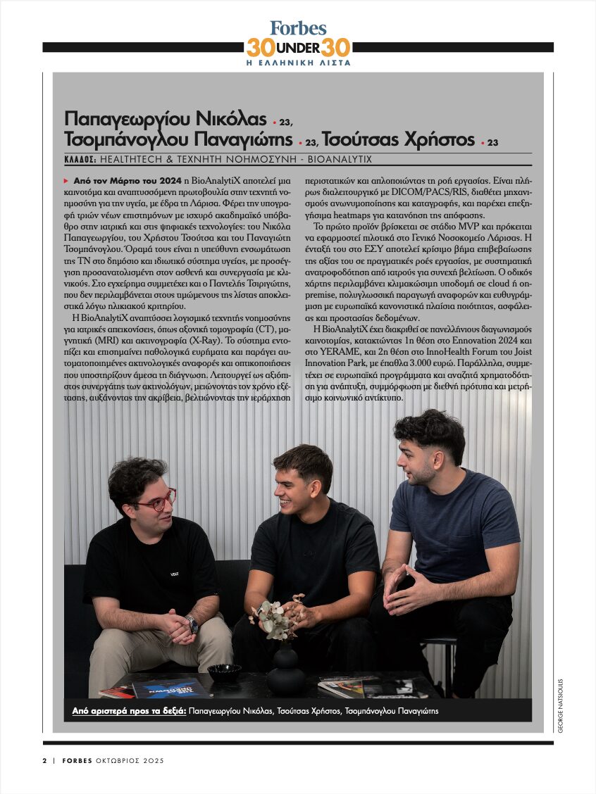 Ιδρυμένη τον Μάρτιο του 2024 στη Λάρισα, η BioAnalytiX συνδυάζει την επιστημονική έρευνα με την ψηφιακή καινοτομία, αναπτύσσοντας λογισμικό τεχνητής νοημοσύνης για ιατρικές απεικονίσεις — από αξονικές και μαγνητικές τομογραφίες έως απλές ακτινογραφίες.