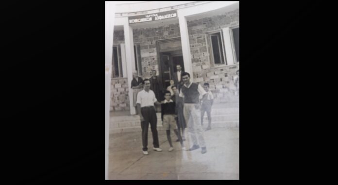 Στη φωτογραφία το πέτρινο κτήριο που στεγάζονταν το παλιό ΙΚΑ, δίπλα από το δημαρχείο της Νέας Ιωνίας και στο προαύλιο δεξιά, που εργάζονταν εκεί ως κλητήρας. ο Άγγελος Παπαδόπουλος, ένας υπερήφανος Πόντιος που εξυπηρετούσε όλους που προσέρχονταν στο ΙΚΑ”.