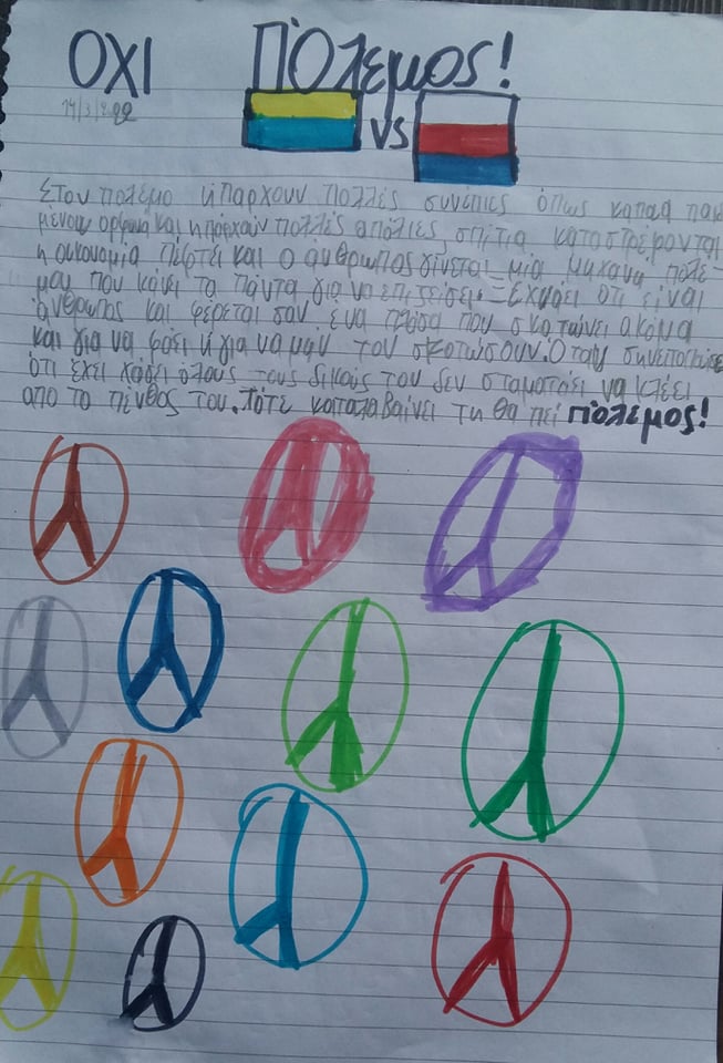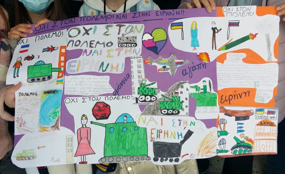 «Όχι στον πόλεμο στην Ουκρανία» διατράνωσαν τα παιδιά μας καταδικάζοντας τον πόλεμο απαιτώντας με τα συνθήματά τους, μέσα από τις εικαστικές τους δημιουργίες, με κολλάζ, πανό και πολλά ακόμα «Ειρήνη Τώρα!» ελπίζοντας η φλόγα της ειρήνης να επικρατήσει παντού. «Ο πόλεμος φέρνει μόνο δυστυχία και το μόνο που γίνεται τελικά είναι να πεθαίνουν οι άνθρωποι». Μια άλλη μαθήτρια νιώθοντας σαν την Άννα Φρανκ κρατάει ημερολόγιο και σημειώνει ότι αυτή η κατάσταση μας οδηγεί «σε ένα τρίτο παγκόσμιο πόλεμο, όπου άνθρωποι και περιβάλλον θα καταστραφούν από τον εγωισμό τους» . Ο Μιχάλης εύχεται «να μην υπάρχουν πόλεμοι , θα κάνω ότι περνάει από το χέρι μου για να σταματήσουν οι πόλεμοι. Σαν παιδί μπορώ να προσφέρω εθελοντική βοήθεια με τρόφιμα και φάρμακα». Ο Δήμος λυπάται για τα παιδιά της ηλικίας του γιατί «δεν πηγαίνουν σχολείο, δεν παίζουν και φοβούνται…». Ο πόλεμος για τον Βασίλη φέρνει πίκρα, πόνο και θάνατο», η Ιωάννα με ένα σύντομο ποίημά της «Ο πόλεμος είναι κακός, όπως ο κακός σου εαυτός, θάνατο σκορπά και παίρνει την ανθρώπινη ομορφιά». Ο Νικόλας πιστεύει ότι «οι χριστιανοί πιστεύουν στην αγάπη και ειρήνη και γι’ αυτό δεν έχει στην Ευρώπη θέση ο φανατισμός και ο όλεθρος ο πολεμικός!»