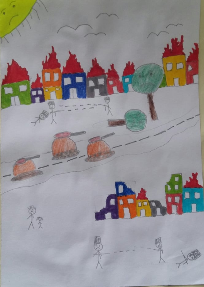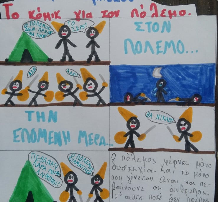 Ο Σεραφείμ βλέπει «παιδιά που δεν γελάνε αλλά κλαίνε από όλα αυτά που γίνονται καθημερινά». Η Μελίνα γράφει «Το κακό παραμύθι του πολέμου», στο οποίο διαπιστώνει, ότι όλα ξεκινούν όταν «δεν υπάρχει σεβασμός και αδελφοσύνη οι άνθρωποι είναι άδειοι και νομίζουν ότι ο πόλεμος θα τους κάνει σπουδαίους. Δεν τους ενδιαφέρει αν πεθάνουν συνάνθρωποί τους, συγγενείς και μικρά παιδιά…», το παραμύθι έχει πάντα τέλος καλό και «…η Ειρήνη αποκαλύπτει στους ανθρώπους το κακό πρόσωπο του Πολέμου κι έτσι τον εξορίζουν από τον κόσμο». Η Μαρίλια λέει στους/στις συμμαθητές/τριές της ότι «ο πόλεμος δεν είναι λύση για του κόσμου όλες τις διαφορές αλλά η αγάπη, η γαλήνη και η ασφάλεια είναι αυτά που μας βοηθούν να ζήσουμε με ομόνοια κι ευτυχία». Η Μαρία ποιητικά μας λέει ότι «ο πόλεμος είναι πράγμα κακό και φέρνει δυστυχία… Κρίμα που οι άνθρωποι δεν παίζουνε ομαδικά για να ‘χουνε ειρήνη κι αγάπη παντοτινά!» Τα παιδιά όμως αντιλαμβάνονται και τις υπόλοιπες συνέπειες ακούγοντας τους γονείς τους, ο Κώστας σημειώνει «επηρεάζεται όλος ο κόσμος, οι τιμές ανεβαίνουν, πολλά πράγματα δεν τα βρίσκεις εύκολα στα ράφια των μαγαζιών, γιατί οι τιμές ανεβαίνουν, η βενζίνη ακρίβυνε και κάποιοι γονείς δεν μπορούν να δουλέψουν ενώ στα σπίτια πρέπει να κάνει πολύ κρύο για να ανάψουμε τη σόμπα…». Για τον Παναγιώτη ο πόλεμος μετατρέπει «τους ανθρώπους σε ζώα χωρίς καλοσύνη και συμπόνια στο διπλανό, τον ηλικιωμένο, στο μικρό παιδί…» και η Αλεξάνδρα πιστεύει ότι δυστυχώς «ο πόλεμος είναι ένα παιχνίδι για τους ισχυρούς που είναι αχόρταγοι για εξουσία, εδάφη και υλικά αγαθά και όχι χαρά και ειρήνη με χαρούμενους ανθρώπους».