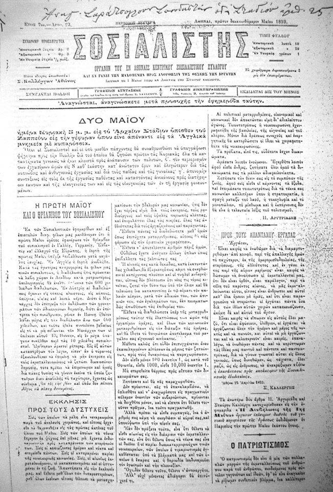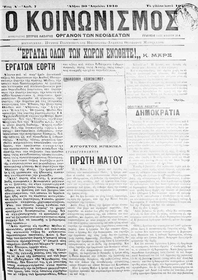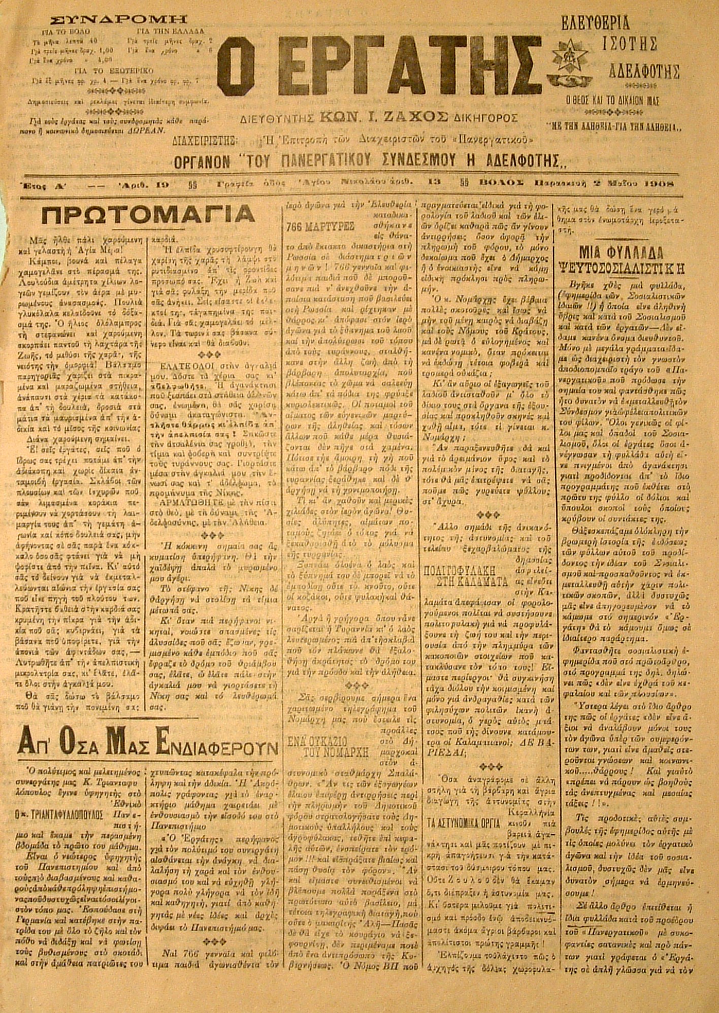 Η πρώτη Πρωτομαγιάτικη εργατική συγκέντρωση του Βόλου που πραγματοποιείται από κοινού από την Πανεργατική Ένωση και το ΣΕΚΕ (τμήμα Βόλου) : «Διά πρώτην φοράν εν Ελλάδι και συνεπώς εν τη πόλει μας η χθεσινή ημέρα (1η Μαϊου) κατά το νέον ημερολόγιον έλαβε τον χαρακτήρα ημέρας εργατικής εμφανίσεως και εορτασμού κατά αλλαχού κρατούντα, θεωρηθείσα και ενταύθα ως διεθνής εργατική εορτή. Ούτω εσημειώθη χθές μία εξαιρετική κίνησις εργατών και εξ άλλων από τα ληφθέντα στρατιωτικά μέτρα, τα οποία εξ υπερβολικής πρόνοιας υπέρ της τάξεως ήσαν πραγματικά ασυνήθη. Η εργατική κίνησις ήρχισε από της 8ης πρωίνής. Οι μετέχοντες του εορτασμού εργάται και ήσαν τούτοι οι ανήκοντες στα σωματεία της Πανεργατικής ενώσεως διακόψαντες από της προηγουμένης εσπέρας τας εργασίας των, ήρχισαν να συγκεντρώνονται εις την πλατείαν Γεωργίου του Α’ (ανατολικώς του Ακταίου). Οι εργάται ούτοι έφερον ερυθρά άνθη και ερυθρά σήματα εις τας κομβιόχους των. Την 9ην πρωίνήν αι διοικήσεις των σωματείων της Πανεργατικής εις φάλαγγα κατά τετράδας με το ερυθρόν λάβαρον της Πανεργατικής ενώσεως και προχωρημένης της Χορωδίας της Σοσιαλιστικής νεολαίας ήτις έψαλλε καθ’ οδόν εργατικά άσματα, διηυθύνθηκαν διά της οδού Δημητριάδος εις την ανωτέρω πλατείαν όπου ανέμενον συγκεντρωμένοι αι άλλοι εργάται, οίτινες εις την εμφάνισιν της ερυθράς σημαίας ήρχισαν να χειροκρατούν και να ζητωκραυγάζουν υπέρ του αγώνος των εργατών. Όταν έφθασαν αι διοικήσεις των σωματείων της Πανεργατικής όλοι αποτέλεσαν μίαν επιβλητικήν μάζαν εις το μέσον της οποίας είχε τοποθετηθεί τραπέζι διά να χρησιμοποιήσει ως βήμα δι’ εκείνους που θα ωμίλουν. Ο σιγαροποιός Σταυράκης φέρων κόκκινον περιβραχιόνιον επί της τηρήσεως του προγράμματος και ούτος έλαβε τον λόγον. Εκεί εις την πλατείαν αφού εψάλη υπό της Χορωδίας ο Διεθνής εργατικός ύμνος ο εμπορούπάλληλος Νικολάου ανέφερε εις τους εργάτας την ιστορίαν της εργατικής Πρωτομαγιάς καθιερωθείσης ως γνωστόν από απεργίαν εργατών εις την Αμερικήν το 1850 την 1η Μαίου εξ αλληλεγγύης προς άλλους απεργούς. Κατόπιν ο υποδηματεργάτης Γεωργίου απήγγειλε το ποίημα αφιερωμένον εις την εργατικήν πρωτομαγιάν και μετά τούτο ο αντιπρόσωπος του Σοσιαλιστικού κόμματος Δημητράτος ωμίλησεν επί της σημερινής θέσεως του εργατικού κόσμου…Ο λόγος του Δημητράτου έληξε με ζητωκραυγές υπέρ της εργατικής τάξεως και της καθιερώσεως του οκταώρου. Κατόπιν ανεγνώσθη το ψήφισμα το οποίο είναι το αυτό εις όλας τα πόλεις. Μετά τούτο η εργατική εκείνη μάζα συνταχθείσα κατά τετράδας προχώρησε με επικεφαλής την χορωδίαν και την ερυθράν σημαίαν της Πανεργατικής και κάμψασα στην οδό Βλαχάβα διευθύνθη εν επιβλητική πάντοτε παρελάσει προς το εξοχικόν κήπον Τσιμπούκι. Η διοίκησις της Πανεργατικής εξέφρασε μόνον παράπονα διά τα ληφθέντα στρατιωτικά μέτρα. Επίσης παρεπονέθη διότι χωροφύλακες ανήλθον εις το κατάστημα της Πανεργατικής και αφήρεσαν εικόνα του Μάρξ και επιγραφάς τας οποίας ηύρον εις την εξωτερικήν πρόσοψιν των γραφείων. Τα μετεσχόντα σωματεία ήταν : Σιδηροδρομικών εν μέρει, Μηχανοσιδηρουργών, Σιγαροποιών, «Αλλληλεγγύη», Ηλεκτροτεχνιτών εν μέρει, Υποδηματεργατών, Ραπτεργατών, Μυλεργατών εν μέρει, Ξυλεργατών, Καφεϋπαλλήλων εν μέρει, Στιβαδόρων καπνού, Παγκαπνεργατικού.…».(Ταχυδρόμος 19 Απριλίου 1919).