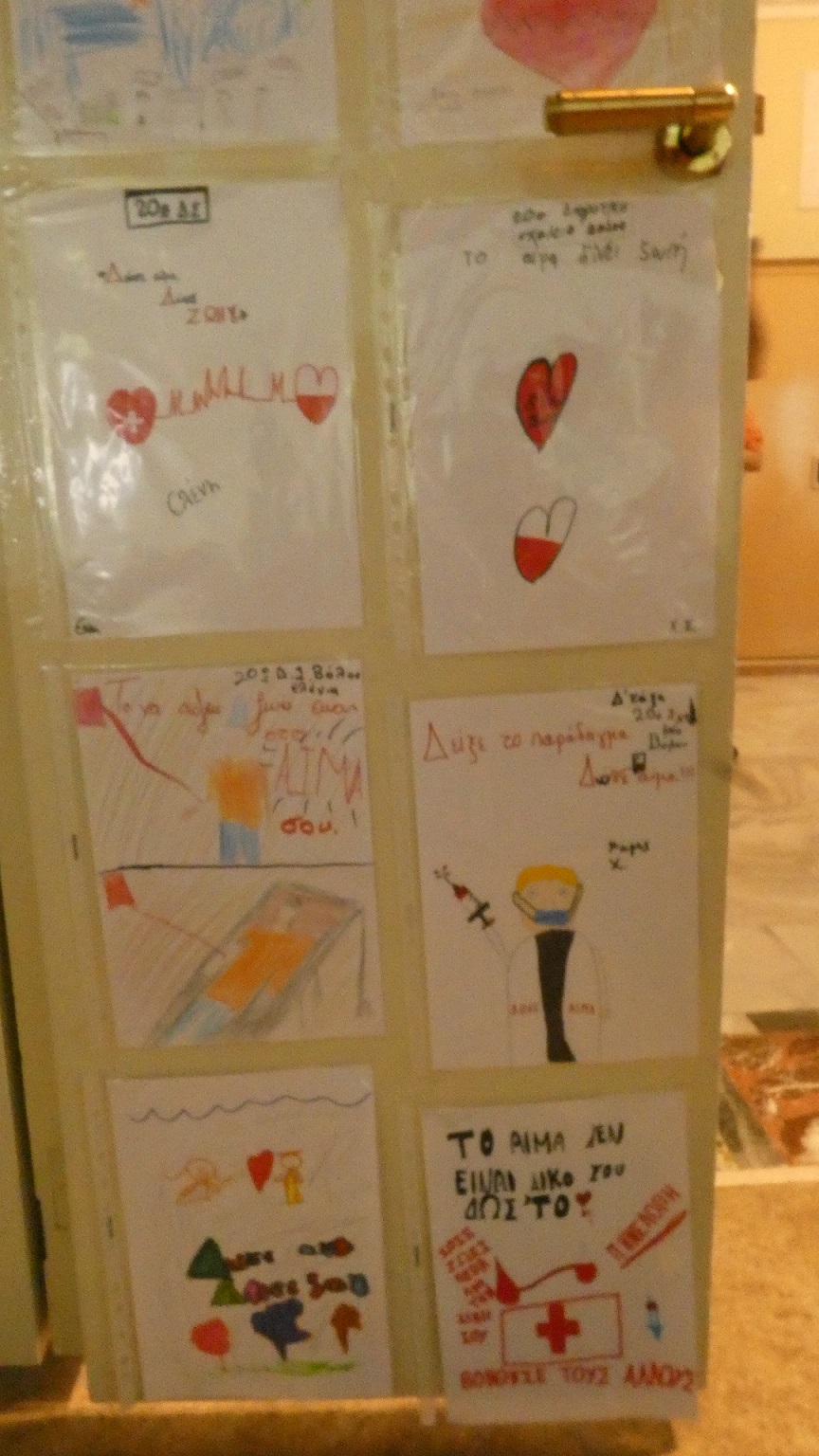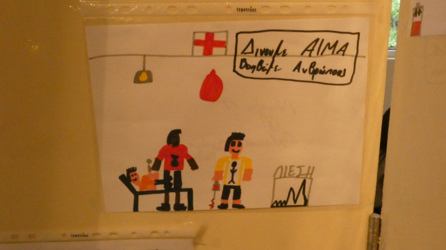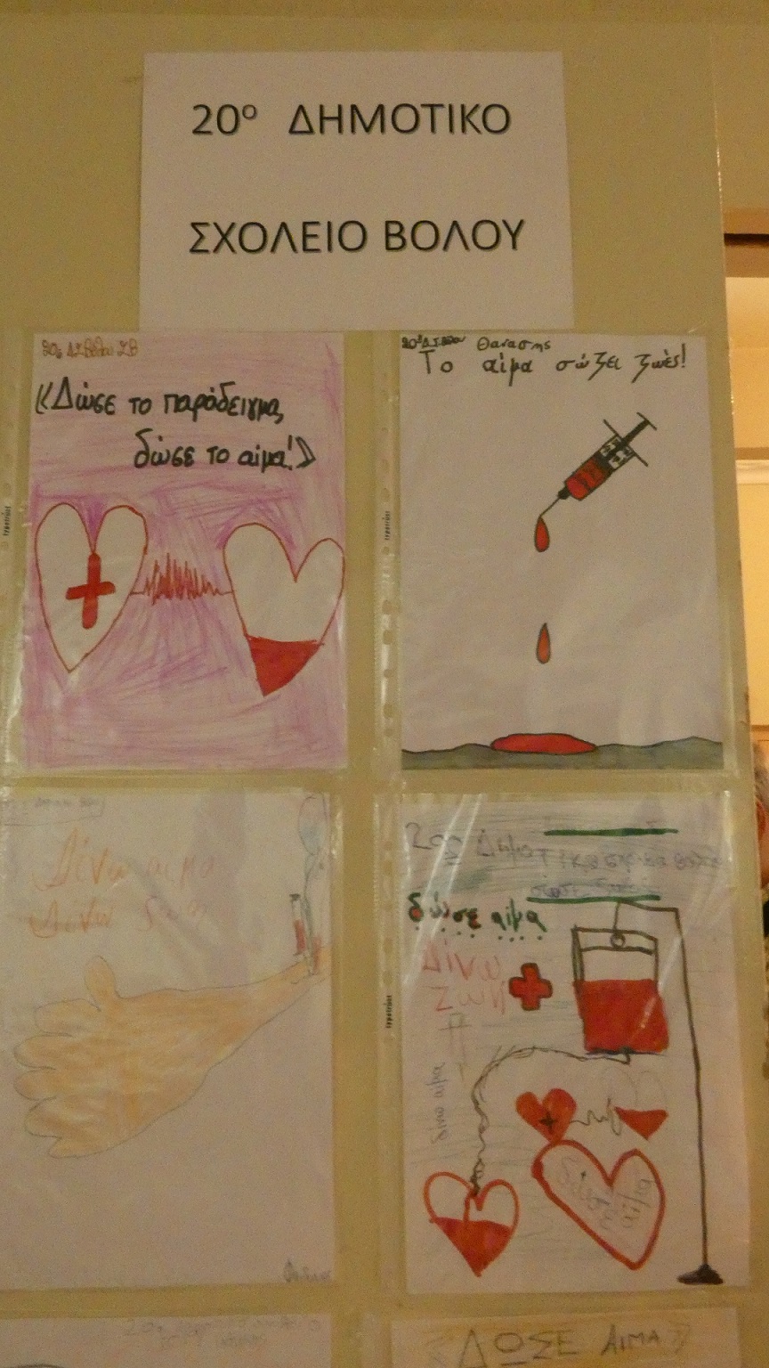 Μπορεί να μην είναι ακόμη εθελοντές αιμοδότες, όμως οι μικροί μαθητές των 18ου και 20ου Δημοτικών Σχολείων Βόλου ζωγράφισαν για την αιμοδοσία και πέρασαν το δικό τους μήνυμα αγάπης και προσφοράς στον συνάνθρωπο. Οι ζωγραφιές των παιδιών εκτέθηκαν στην αίθουσα και συγκέντρωσαν τον θαυμασμό όλων.