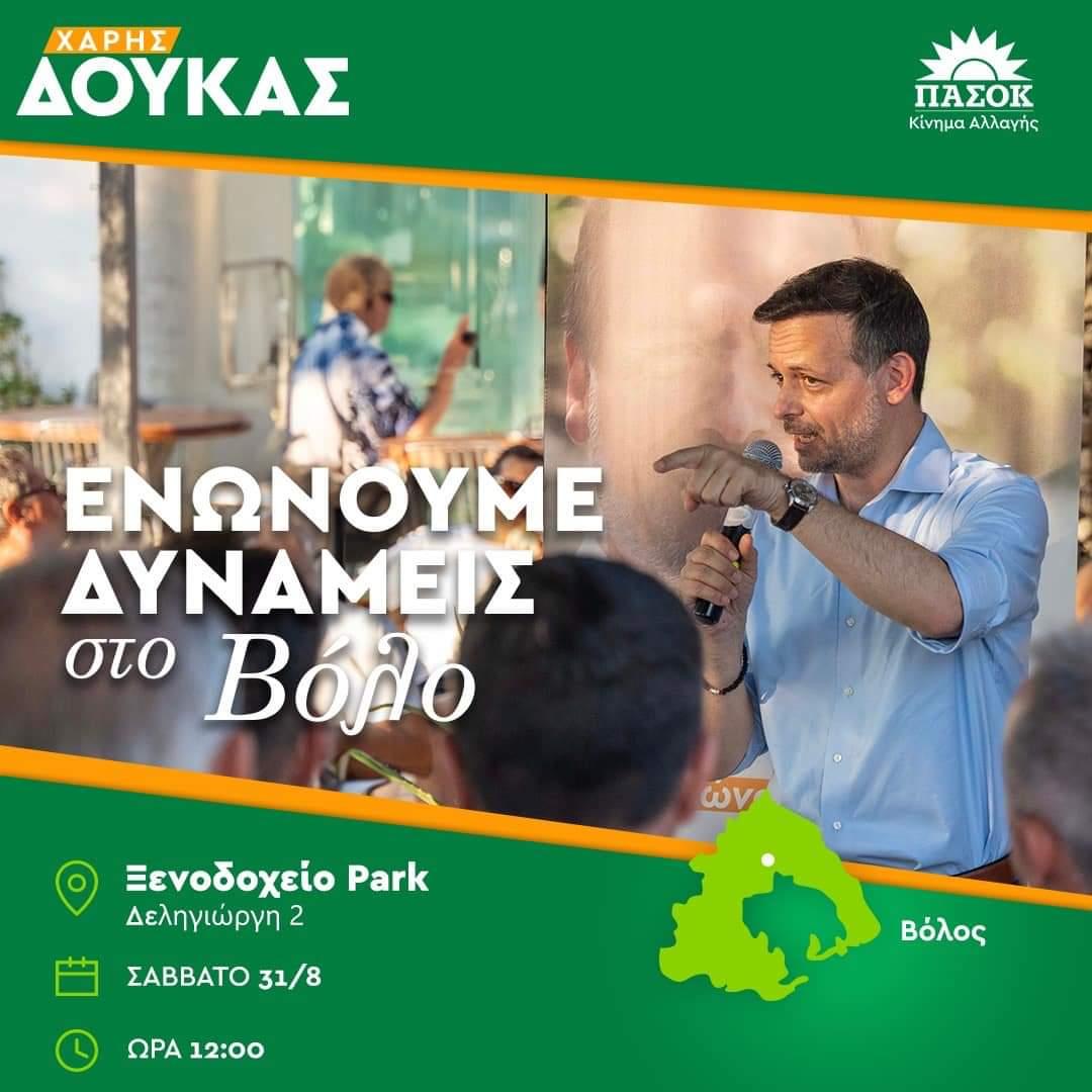 Στο ξενοδοχείο Πάρκ στον Βόλο θα μιλήσει στις 12 το μεσημέρι του Σαββάτου 31 Αυγούστου ο υποψήφιος πρόεδρος του ΠΑΣΟΚ – Κινήματος Αλλαγής, Χάρης Δούκας, στο πλαίσιο της περιοδείας του στη Μαγνησία.