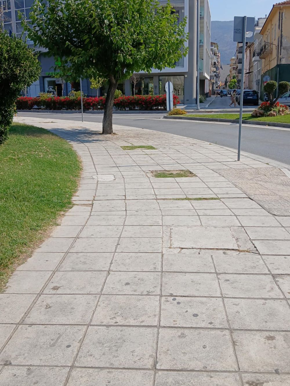 Πολλές παγίδες για τους πεζούς κρύβει το πεζοδρόμιο που περνά μπροστά από το δημαρχείο του Βόλου στη Γρ. Λαμπράκη, αφού από τη μια οι λακκούβες από την υποχώρηση των πλακών και από την άλλη οι βάσεις που κάποτε υπήρχαν δέντρα, αλλά πλέον έχουν κοπεί, ωστόσο, οι βάσεις παρέμειναν ή τσιμεντώθηκαν.