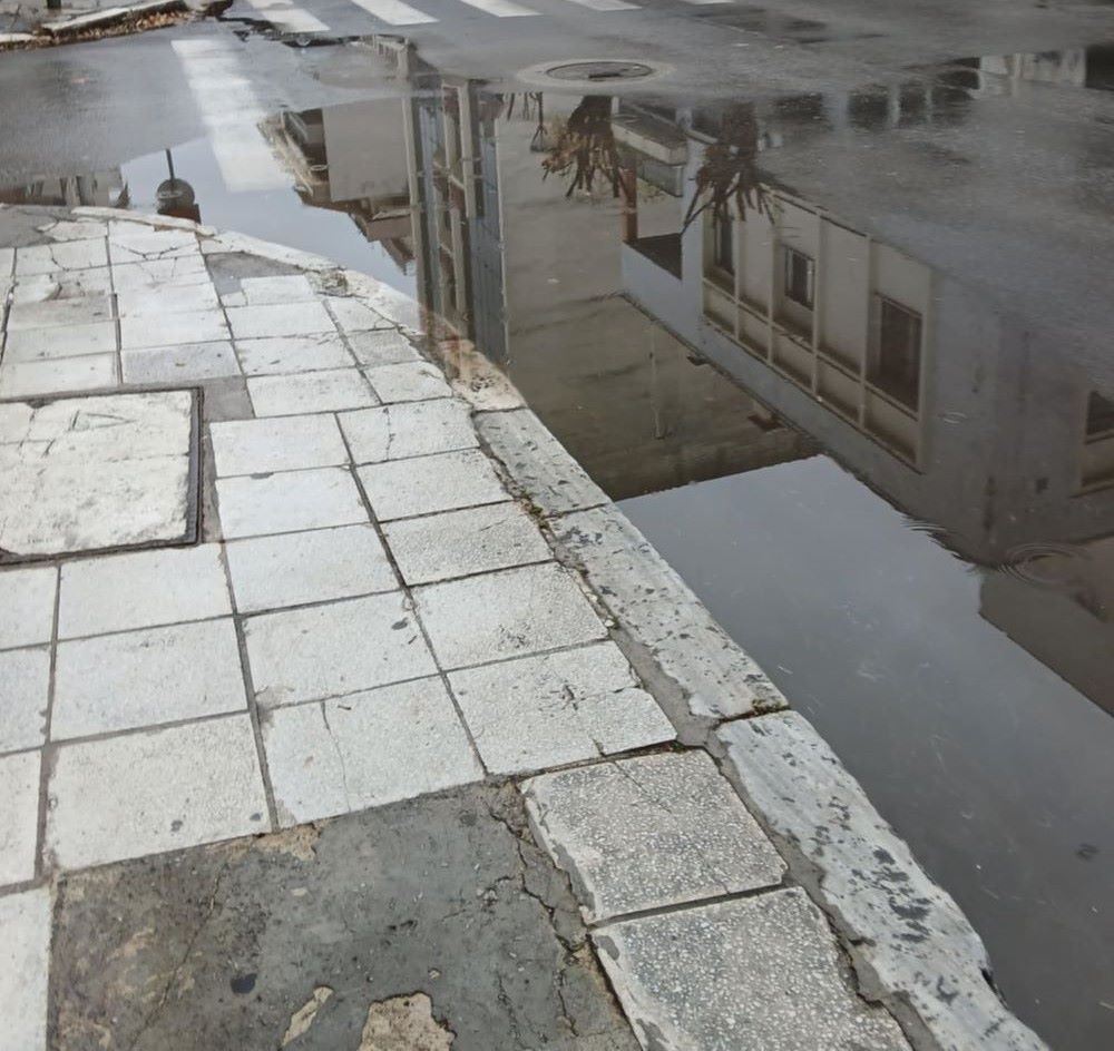 Επίσης σε διάφορα σημεία σε πεζοδρόμια οι φθορές σε πλάκες και κυβόλιθους, οδηγούν στο να μαζεύονται ποσότητες νερού δυσκολεύοντας την κίνηση.