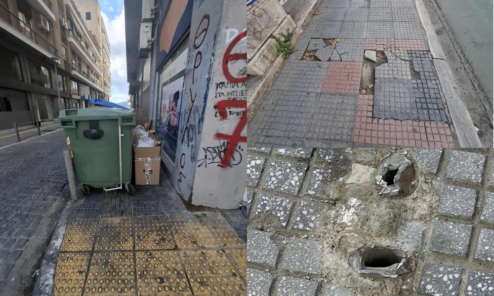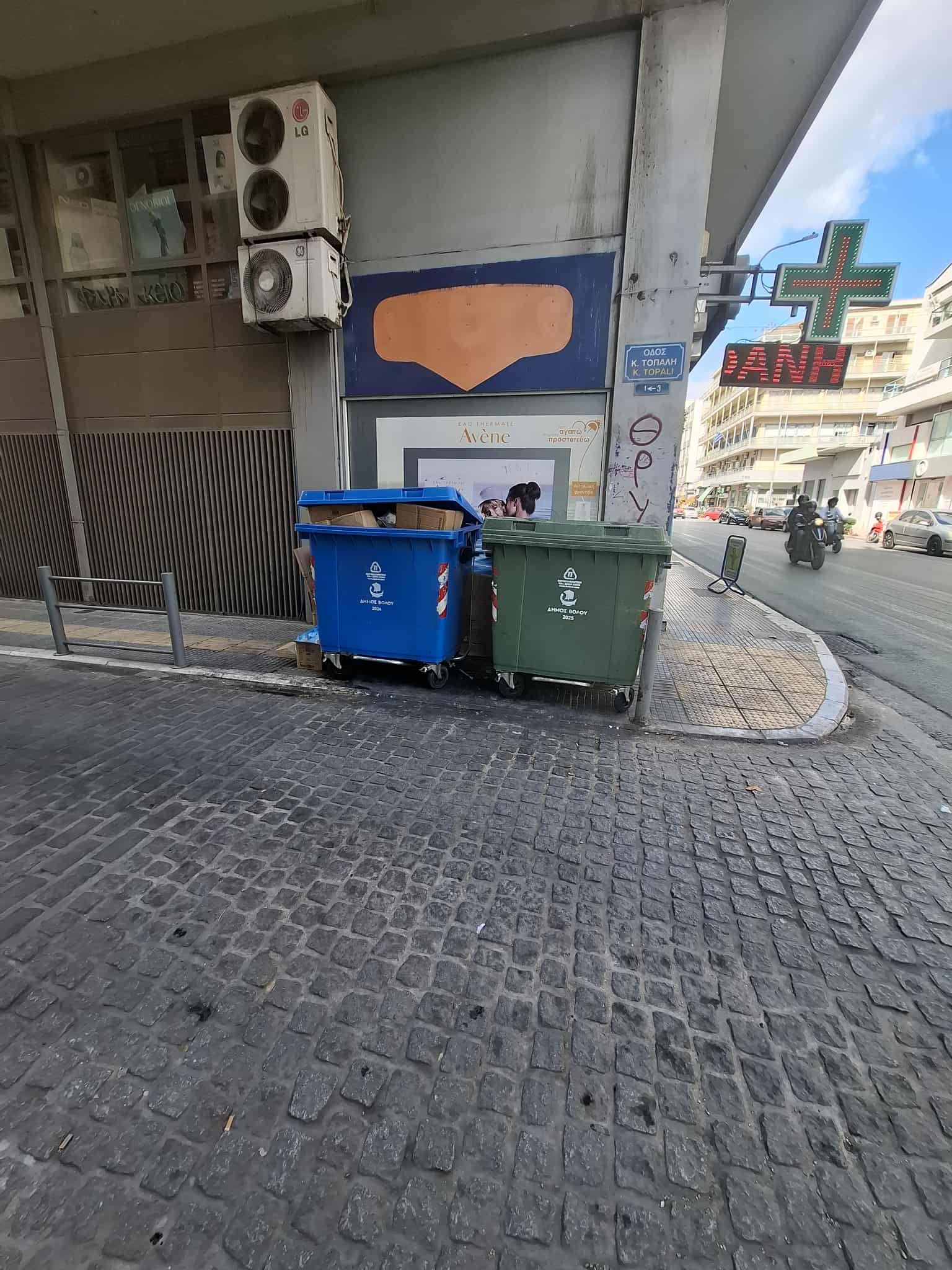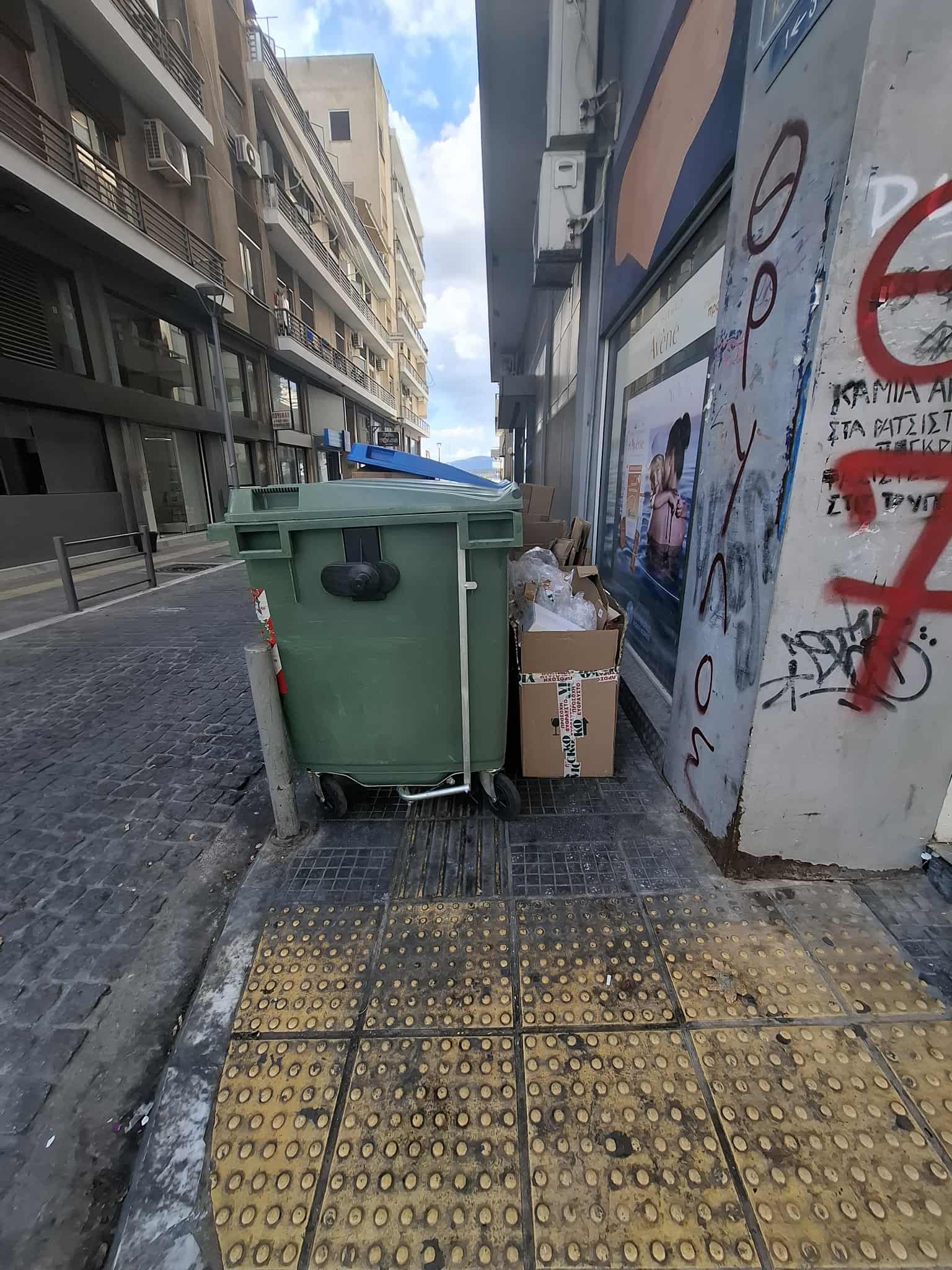 Λίγα μέτρα δε πιο μακριά, επί της οδού Τοπάλη και μια ανάσα από την είσοδο γνωστού ξενοδοχείου, οι κάδοι απορριμμάτων βρίσκονται πάνω στο πεζοδρόμιο, με αποτέλεσμα οι πεζοί, οι άνθρωποι με κινητικά προβλήματα αλλά και μητέρες με τα καροτσάκια τους να πρέπει να περπατήσουν μέσα στον δρόμο.