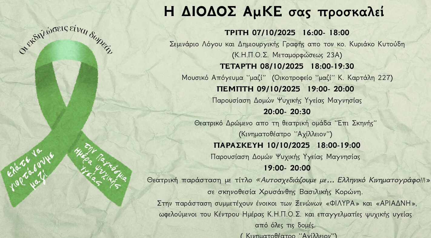 Με πλήθος εκδηλώσεων, δωρεάν για όλους, η ΔΙΟΔΟΣ ΑμΚΕ, με έδρα τον Βόλο, γιορτάζει την Παγκόσμια Ημέρα Ψυχικής Υγείας.