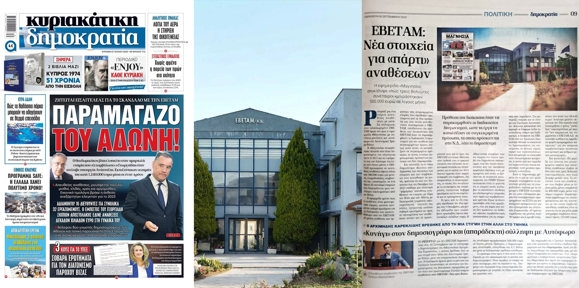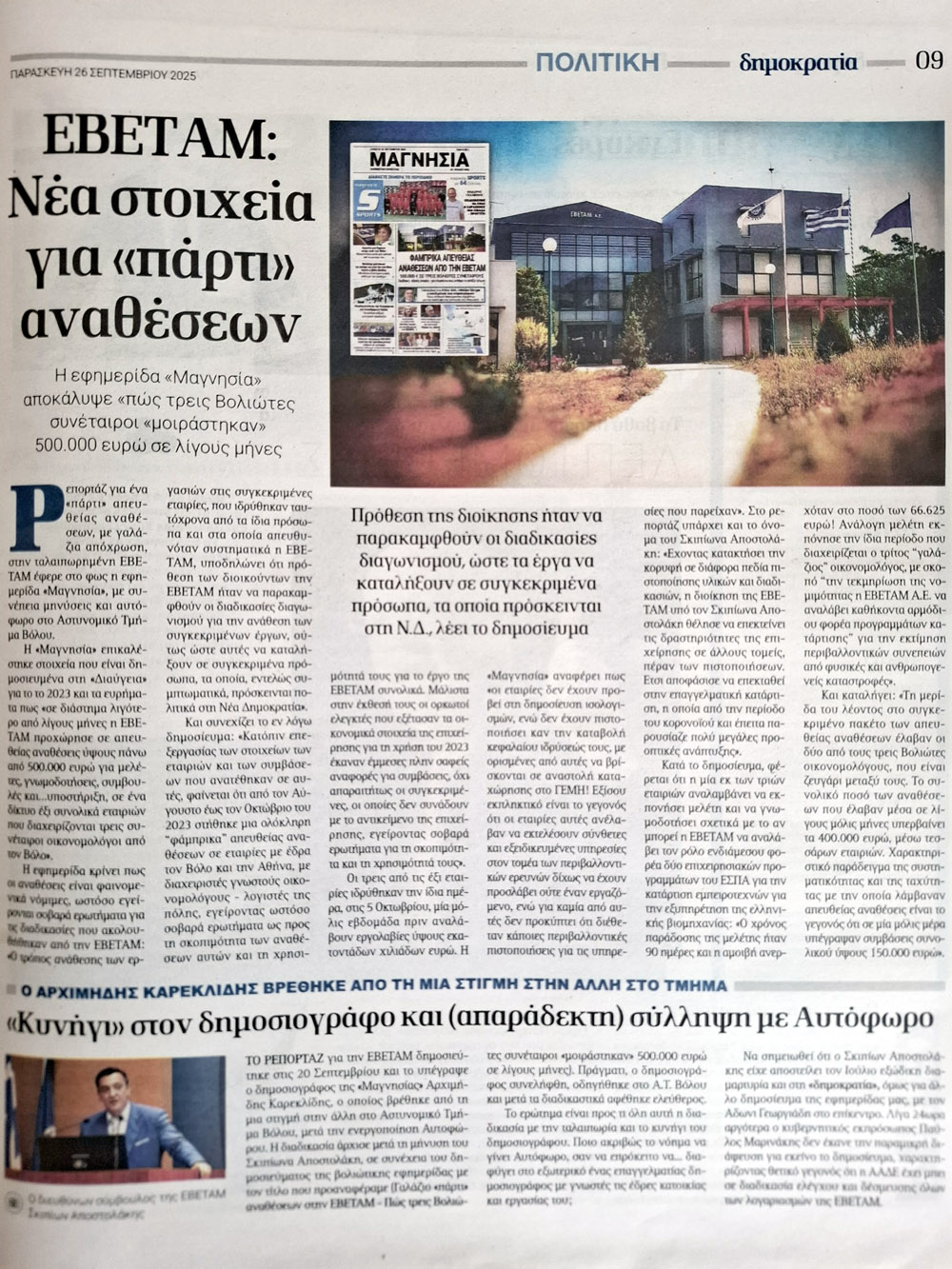 Θέμα στο πανελλήνιο γίνονται οι αποκαλύψεις της εφημερίδας «Μαγνησία» για την «αμαρτωλή» ΕΒΕΤΑΜ και το πάρτι των απευθείας αναθέσεων σε «γαλάζιους» Βολιώτες οικονομολόγους. Τα δημοσιεύματα της «Μ» του περασμένου Ιουλίου για το οικονομικό αδιέξοδο που αντιμετωπίζει η ΕΒΕΤΑΜ, μετά την δέσμευση των τραπεζικών της λογαριασμών, αναπαράχθηκαν από την πανελλήνιας κυκλοφορίας εφημερίδα «Δημοκρατία» υπό τον τίτλο «Παραμάγαζο του Αδωνη- Ζητείται εισαγγελέας για το σκάνδαλο με την ΕΒΕΤΑΜ», προκαλώντας πανικό τόσο στην πρώην διοίκηση της ΕΒΕΤΑΜ που «ξηλώθηκε» από τον νέο υπουργό Ανάπτυξης Τάκη Θεοδωρικάκο, όσο και σε όσους επωφελήθηκαν οικονομικά από τον πακτωλό χρημάτων που μοιράστηκαν. Με ολοσέλιδο δημοσίευμά της η εφημερίδα «Δημοκρατία», αναδεικνύει τα όσα υποστήριξε το περασμένο Σάββατο η «Μαγνησία» με τον τίτλο «ΕΒΕΤΑΜ: Νέα στοιχεία για «πάρτι» αναθέσεων» την ίδια στιγμή που η διοίκηση της, υπό διερεύνηση επιχείρησης, τηρεί «σιγή ιχθύος» αποφεύγοντας να τοποθετηθεί. Ενδεικτικό του πανικού που έχουν προκαλέσει τα δημοσιεύματα της «Μαγνησίας» και τα οποία ανέδειξαν τόσο η «Δημοκρατία» όσο και η ιστοσελίδα tvxs.gr, ήταν η μήνυση που υπέβαλε ο πρ. αντιπρόεδρος της ΕΒΕΤΑΜ Σκιπίωνας Αποστολάκης, σε βάρος του εκδότη-δημοσιογράφου Αρχιμήδη Καρεκλίδη για συκοφαντική δυσφήμηση, με συνέπεια αυτός να συλληφθεί την Τετάρτη και να οδηγηθεί στο Α.Τ. Βόλου για τα περαιτέρω, ενώ λίγη ώρα αργότερα αφέθηκε ελεύθερος. Μάλιστα αντί οποιουδήποτε άλλου μάρτυρα που θα μπορούσε να καταθέσει για την υπόθεση, ο μηνυτής δεν προτίμησε κάποιον από την επιχείρηση, αλλά τον τηλεπαρουσιαστή Σωτήρη Πολύζο, ο οποίος παρείχε συμβουλές επικοινωνίας, έναντι δεκάδων χιλιάδων ευρώ! Τα δημοσιεύματα της «Μαγνησίας» προσέλκυσαν το ενδιαφέρον και κοινοβουλευτικών κομμάτων, τα οποία θα αναδείξουν το θέμα το επόμενο διάστημα, με επερωτήσεις στη Βουλή.