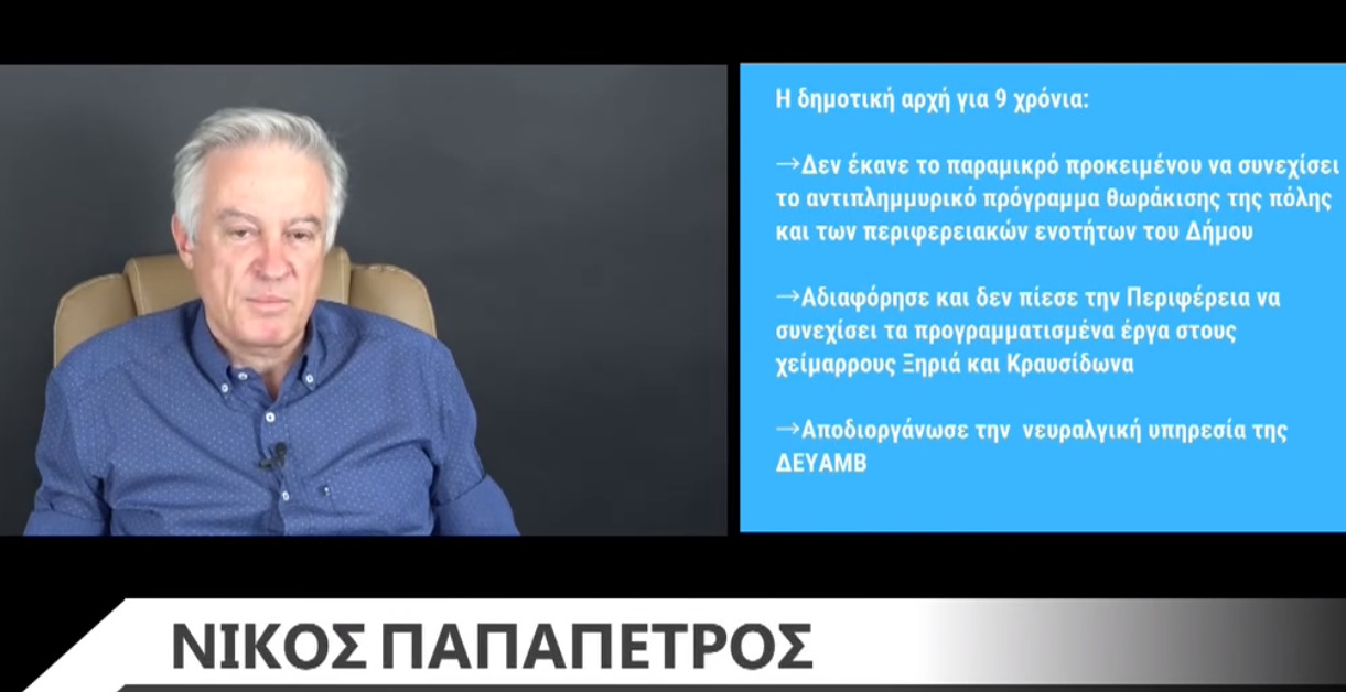 «Για 9 χρόνια δεν έκανε το παραμικρό για να συνεχίσει το αντιπλημμυρικό πρόγραμμα θωράκισης της πόλης και των περιφερειακών ενοτήτων. Αδιαφόρησε και δεν πίεσε την Περιφέρεια να συνεχίσει τα προγραμματισμένα έργα στους χειμάρρους του Κραυσίδωνα και του Ξηριά και αποδιοργάνωσε την νευραλγική υπηρεσία της ΔΕΥΑΜΒ», επεσήμανε μεταξύ άλλων ο κ. Παπαπέτρος στην ανάλυσή του στο το έγινε και τι όχι στην πόλη.