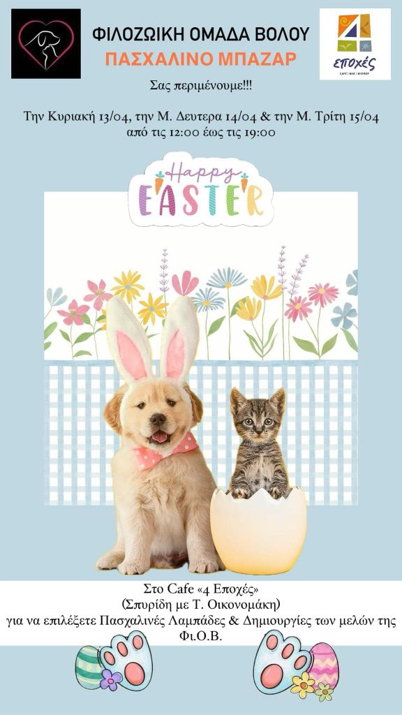 Πασχαλινό παζάρι θα πραγματοποιήσουν εθελοντές της Φιλοζωικής Ομάδας Βόλου την Κυριακή των Βαΐων 13/4, τη Μ. Δευτέρα 14/4 και τη Μ. Τρίτη 15/4 από τις 12:00 έως τις 19:00 στο cafe «4 εποχές» στη Σπ.Σπυριδη με Τ. Οικονομάκη, στον Βόλο.