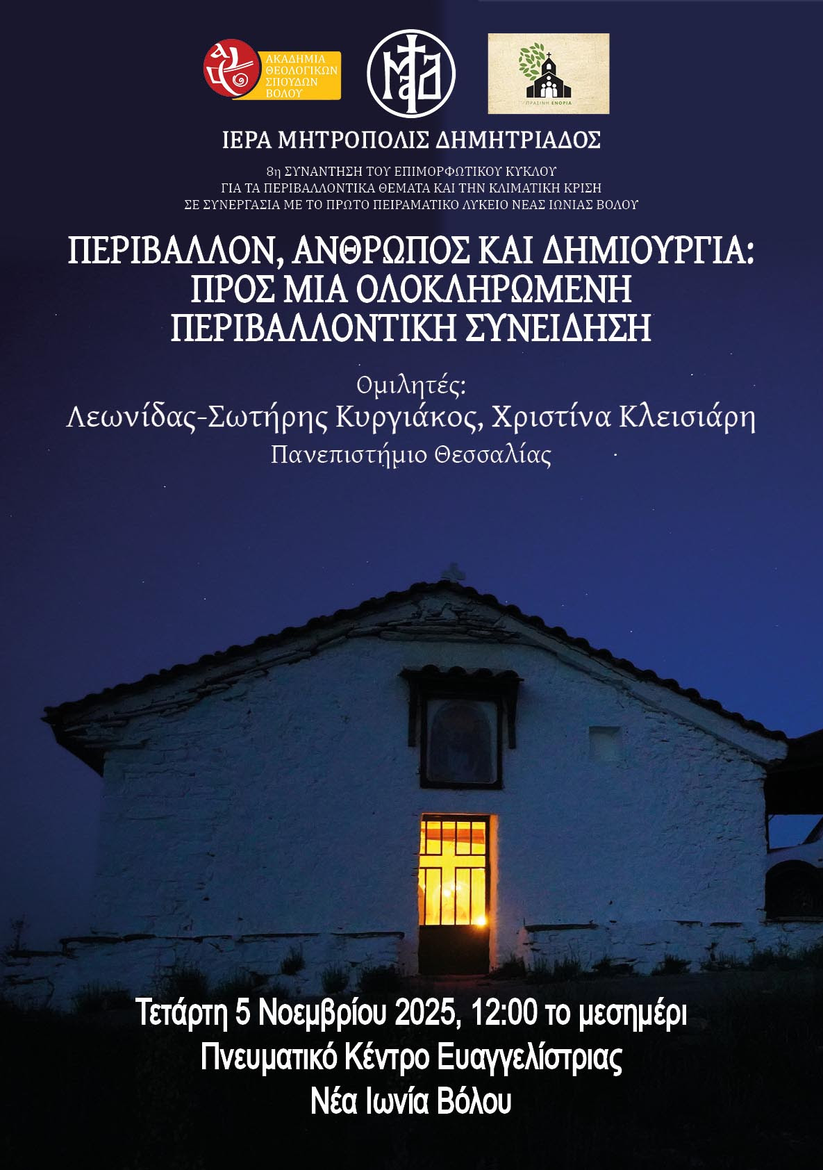 Επιμορφωτική εκδήλωση του περιβαλλοντολογικού επιμορφωτικού κύκλου με γενικό τίτλο : «Περιβάλλον, Άνθρωπος και Δημιουργία: Προς μια Ολοκληρωμένη Περιβαλλοντική Συνείδηση» θα πραγματοποιηθεί στο Πνευματικό Κέντρο της Ευαγγελίστριας της Νέας Ιωνίας Βόλου, η οποία αποτελεί την πρότυπη «πράσινη ενορία» στο πλαίσιο των οικολογικών δράσεων της Μητροπόλεως.