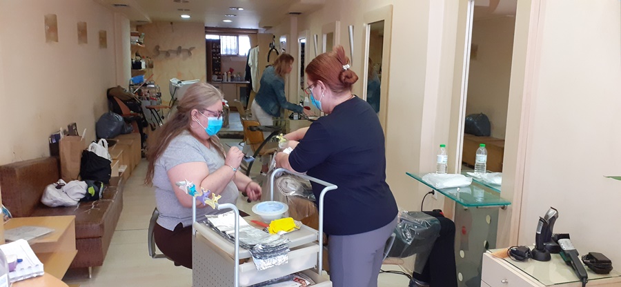 Στο κομμωτήριο της κ. Βιβής Σταυρίδου στην οδό Γκλαβάνη, οι πελάτισσές της έρχονται κατόπιν ραντεβού, ενώ η ίδια και οι εργαζόμενοί της βιώνουν μία νέα πραγματικότητα. Σύμφωνα με την ίδια, τα ραντεβού έχουν κλείσει για τις επόμενες δύο περίπου εβδομάδες, ενώ ο κόσμος δείχνει κατανόηση με αυτό το νέο πρόγραμμα. Στο κομμωτήριο πλέον ισχύουν άλλοι υγειονομικοί κανόνες με την κ. Σταυρίδου να παραδέχεται πως η μάσκα είναι λίγο δύσκολη την ώρα της δουλειάς, όμως όλοι θα τη συνηθίσουν. Πάντως η ίδια, οι εργαζόμενοί της αλλά και οι πελάτισσες καλωσόρισαν αυτή τη νέα κανονικότητα με χαμόγελο.