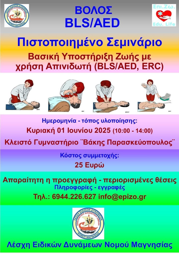Η Λέσχη Ειδικών Δυνάμεων Μαγνησίας υλοποιεί την Κυριακή 1 Ιουνίου 2025 (10.00 ως 14.00) το πιστοποιημένο σεμινάριο Βασική Υποστήριξη Ζωής με Αυτόματο Εξωτερικό Απινιδωτή (BLS/AED, ERC) στο κλειστό γυμναστήριο “Βάκης Παρασκευόπουλος” (Ρ. Φεραίου με Γλάδστωνος).