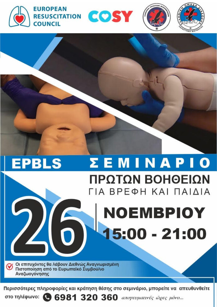 Η Ελληνική Ομάδα Διάσωσης Μαγνησίας, μέσω της Διεύθυνσης Εκπαίδευσης και του Τμήματος Πρώτων Βοηθειών, διοργανώνει την Τετάρτη 26 Νοεμβρίου 2025, από 15:00 έως 21:00, στον Βόλο, το πιστοποιημένο εκπαιδευτικό πρόγραμμα Παιδιατρικής Βασικής Υποστήριξης Ζωής (EPBLS), υπό την αιγίδα του Ευρωπαϊκού Συμβουλίου Αναζωογόνησης (ERC).