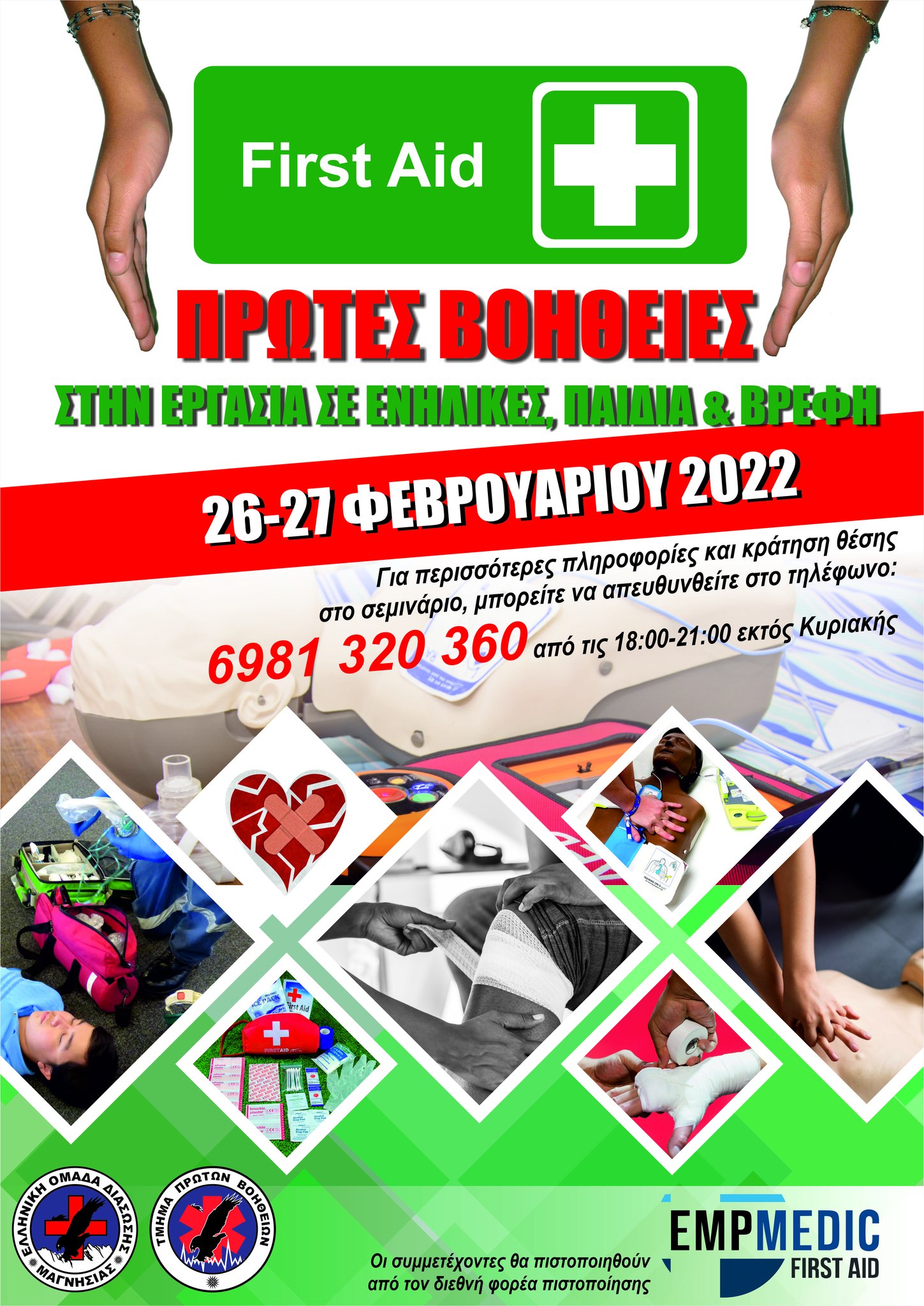 Το τμήμα Πρώτων Βοηθειών της Ελληνικής Ομάδας Διάσωσης Μαγνησίας διοργανώνει πλήρη και πιστοποιημένη εκπαίδευση Πρώτων Βοηθειών, με σεμινάριο 16 ωρών, το Σαββατοκύριακο 26 και 27 Φεβρουαρίου στην πόλη του Βόλου, υπό την αιγίδα του διεθνούς φορέα πιστοποίησης EMP Medic First Aid. Μέσω σχετικής ανακοίνωσης με την επιτυχή ολοκλήρωση της εκπαίδευσης οι συμμετέχοντες θα λαμβάνουν Πιστοποίηση παροχέα Πρώτων Βοηθειών, διεθνώς αναγνωρισμένη. Επίσης η πιστοποίηση θα συνοδεύεται και από ταυτότητα παροχέα Πρώτων Βοηθειών με προσωπικό Αρ. μητρώου στον οργανισμό. Η εκπαίδευση περιλαμβάνει θεωρητική εκπαίδευση με ενημερωτικά στοιχεία για την πανδημία Covid-19 (τρόποι μετάδοσης – προφύλαξης) καθώς και οι διαφοροποιήσεις στον αλγόριθμο του BLS/AED, πρακτική εκπαίδευση στα Μέσα Ατομικής Προστασίας (Μ.Α.Π) (σωστή χρήση της μάσκας, γαντιών κ.α.), καρδιοπνευμονική Αναζωογόνηση (ΚΑΡΠΑ), αυτόματο Εξωτερικό Απινιδωτή (ΑΕΑ), πλάγια Θέση Ασφαλείας ή Θέση Ανάνηψης, καθώς και ένα μεγάλο φάσμα από Βασικές Πρώτες Βοήθειες σε ενήλικες, παιδιά και βρέφη τόσο σε θεωρητικό όσο και πρακτικό επίπεδο χρησιμοποιώντας εξειδικευμένο εξοπλισμό.