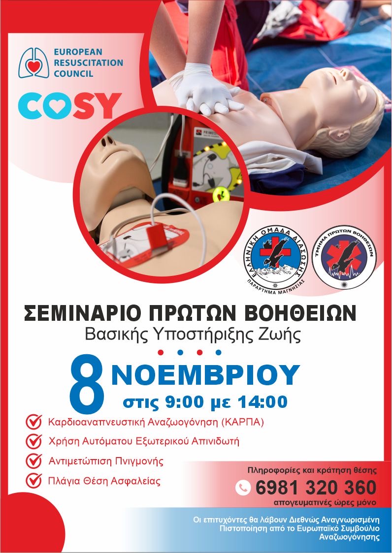 Η Ελληνική Ομάδα Διάσωσης Μαγνησίας διοργανώνει το Σάββατο 8 Νοεμβρίου, από 09:00 έως 14:00, πιστοποιημένο Σεμινάριο Πρώτων Βοηθειών – Βασικής Υποστήριξης Ζωής (BLS), διάρκειας πέντε ωρών, υπό την αιγίδα του Ευρωπαϊκού Συμβουλίου Αναζωογόνησης (ERC).