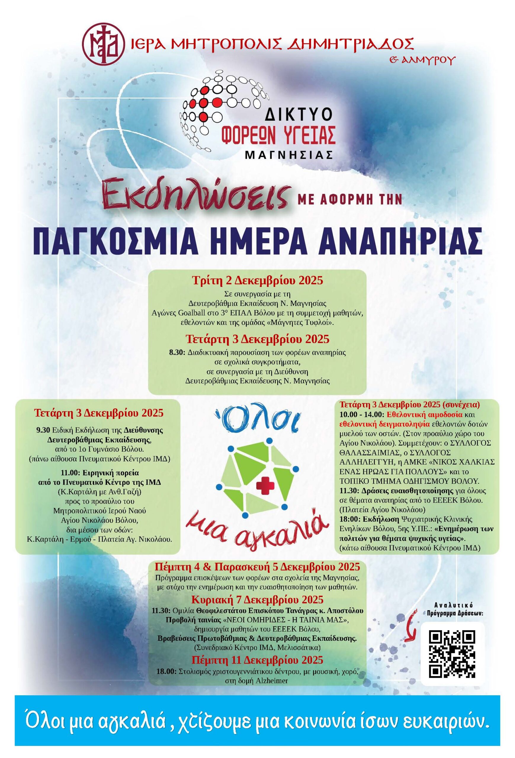 Δράσεις και τις εκδηλώσεις διοργανώνει το Δίκτυο Φορέων Υγείας της Ιεράς Μητροπόλεως Δημητριάδος, με αφορμή την Παγκόσμια Ημέρα Αναπηρίας, 3 Δεκεμβρίου.