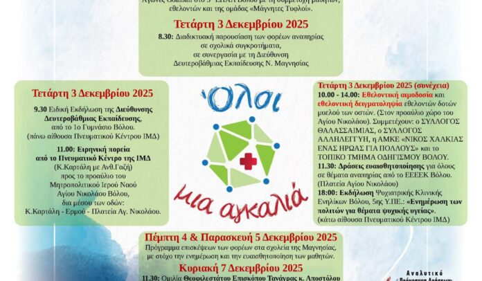 Οι δράσεις αυτές θα παρουσιαστούν σε συνέντευξη Τύπου την Παρασκευή 28 Νοεμβρίου, στις 12.00, στο Πνευματικό Κέντρο του Ιερού Ναού Αναλήψεως του Χριστού Βόλου.