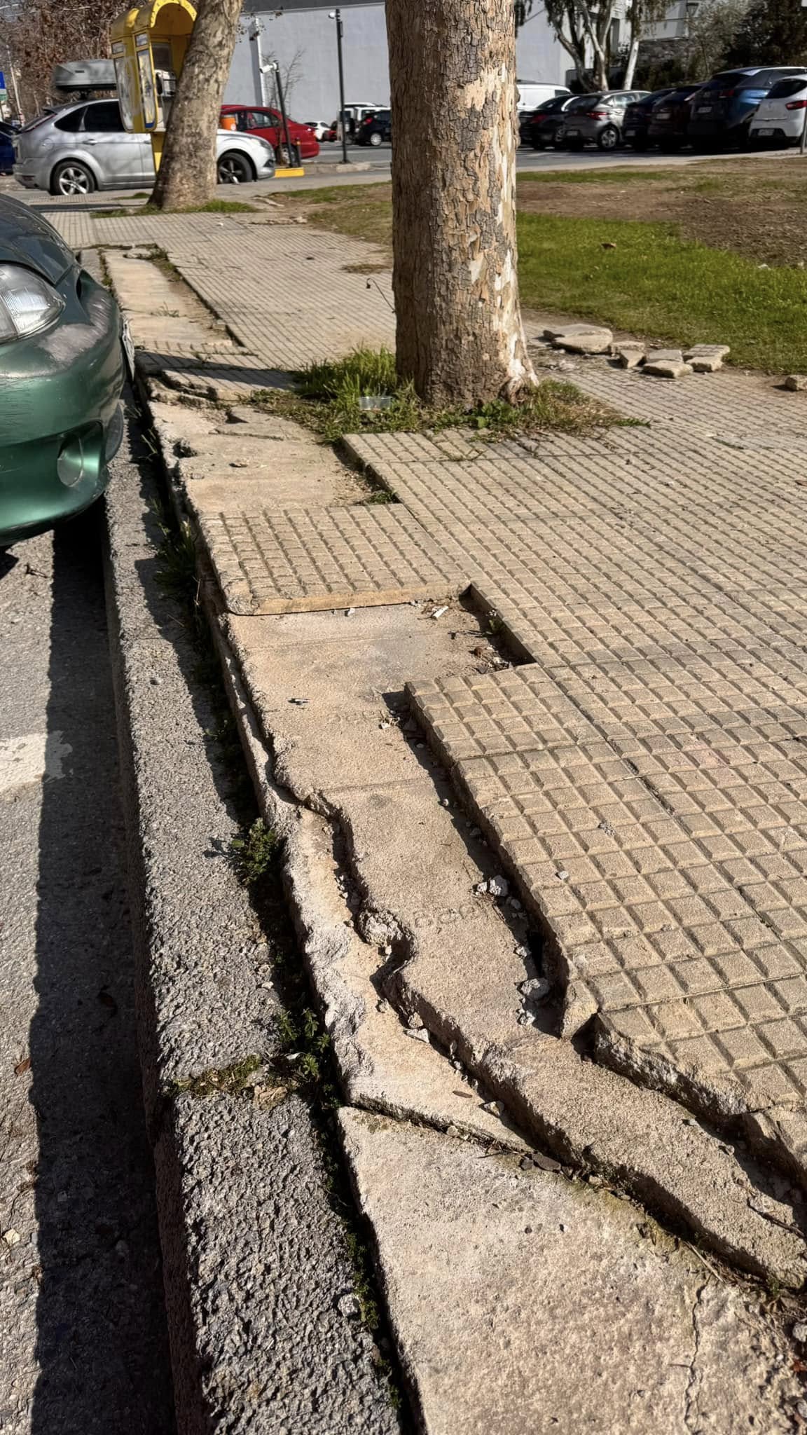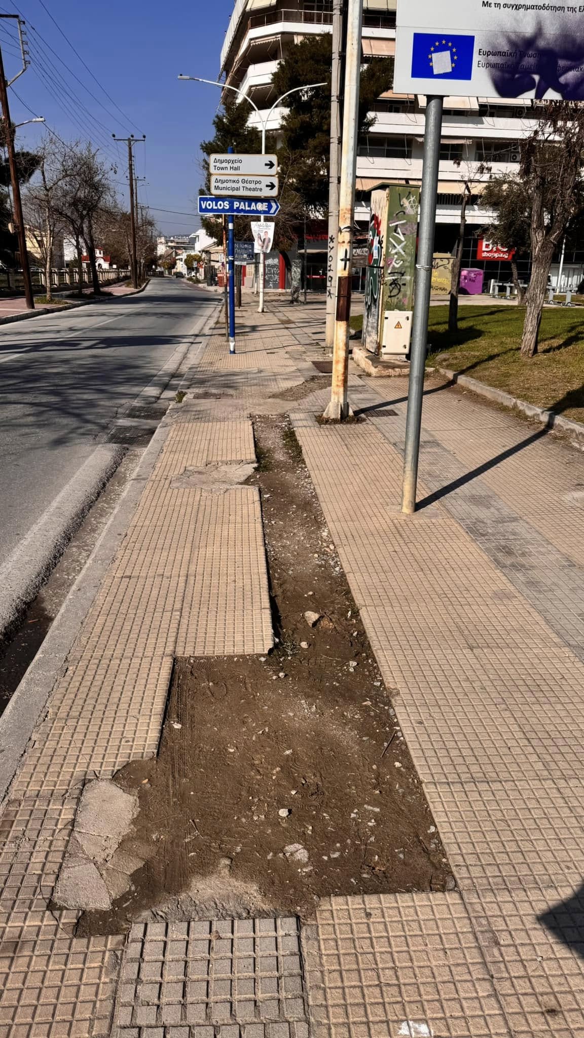 Το πεζοδρόμιο επί της Παπαδιαμάντη μετά τον κόμβο βρίσκεται σε κακή κατάσταση με πολλές πλάκες να έχουν ξεκολλήσει και να φαίνεται από κάτω το χώμα. Επίσης υπάρχει ο κίνδυνος κάποιος περαστικός να παραπατήσει και να πάθει κάποιο ατύχημα.