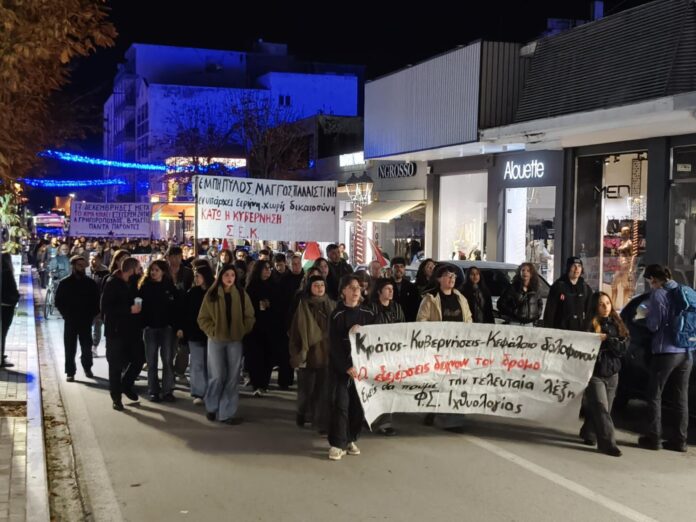 Η διαδήλωση ξεκίνησε από τον Θόλο του κτιρίου Παπαστράτος, με τη συμμετοχή περισσότερων από 500 ατόμων, και κινήθηκε μέσα από κεντρικούς δρόμους της πόλης, καταλήγοντας στο σημείο εκκίνησης. Οι διαδηλωτές κρατούν πανό και φωνάζουν συνθήματα, τιμώντας τη μνήμη του Αλέξη.