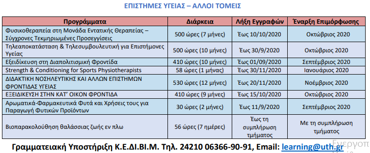 Το Κέντρο Επιμόρφωσης και Διά Βίου Μάθησης (Κ.Ε.ΔΙ.ΒΙ.Μ.) του Πανεπιστημίου Θεσσαλίας διοργανώνει προγράμματα εκπαίδευσης που τα περισσότερα πληρούν τις προϋποθέσεις του νέου νόμου (ΦΕΚ 13/29-01-2019) ως προς την μοριοδότηση. Επιπλέον, στοχεύει στην προώθηση επιμορφωτικών προγραμμάτων e–learning ανταποκρινόμενο στις σύγχρονες εκπαιδευτικές εξελίξεις και τις απαιτήσεις αρκετών επαγγελματικών κλάδων διευκολύνοντας με αυτόν τον τρόπο την παροχή γνώσης προς όλους. Το Κ.Ε.ΔΙ.ΒΙ.Μ. του Πανεπιστημίου Θεσσαλίας σας καλεί να γνωρίσετε τα εκπαιδευτικά του προγράμματα και θα βρίσκεται πάντα κοντά σας για οποιαδήποτε ενημέρωση.