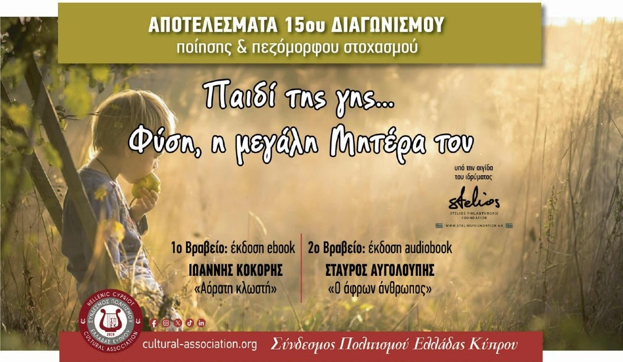 Τα αποτελέσματα του 15ου Διεθνούς Διαγωνισμού Ποίησης και Πεζόμορφου Στοχασμού, ανακοίνωσε ο Σύνδεσμος Πολιτισμού Ελλάδας- Κύπρου, που πραγματοποιήθηκε με την αιγίδα του Stelios Philanthropic Foundation. Η φετινή θεματική ήταν αφιερωμένη στη σχέση του ανθρώπου – και ιδιαίτερα του παιδιού – με τη Φύση, αναδεικνύοντας τη Γη ως «Μεγάλη Μητέρα» που εμπνέει, προβληματίζει και καλεί σε δημιουργία.