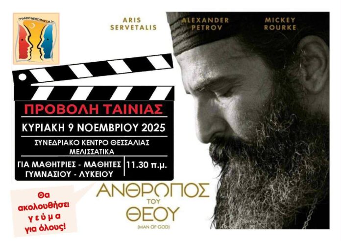 Η ταινία, σε σκηνοθεσία Yelena Popovic, με πρωταγωνιστές τους Άρη Σερβετάλη, Alexander Petrov και Mickey Rourke, παρουσιάζει τη ζωή και το έργο του Αγίου Νεκταρίου, φωτίζοντας τη βαθιά πίστη και την ταπείνωσή του. Η πρώτη προβολή θα πραγματοποιηθεί στις 11:30 π.μ. στο Συνεδριακό Κέντρο Θεσσαλίας στα Μελισσάτικα και απευθύνεται σε μαθητές και μαθήτριες Γυμνασίου και Λυκείου, καθώς και στις οικογένειές τους. Μετά την προβολή θα ακολουθήσει γεύμα για όλους.