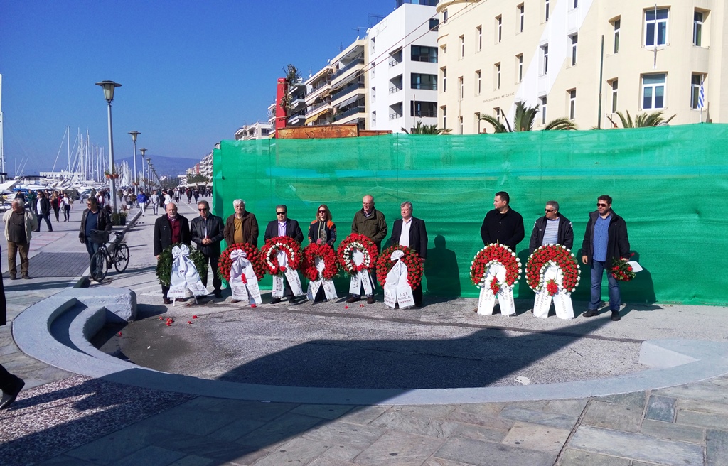 Η κατάθεση των στεφάνων έγινε δίπλα από το ιστορικό σκάφος της Αργούς, που στήθηκε στην παραλία ενόψει των γιορτών, από εκπροσώπους του Εργατικού Κέντρου Βόλου, της ΑΔΕΔΥ, των δασκάλων, των καθηγητών, της Περιφερειακής Ενότητας, του ΣΥΡΙΖΑ, των εργαζομένων στο Δήμο Βόλου, του Εργαζομένου Κοριτσιού και του Οργανισμού Λιμένος Βόλου.